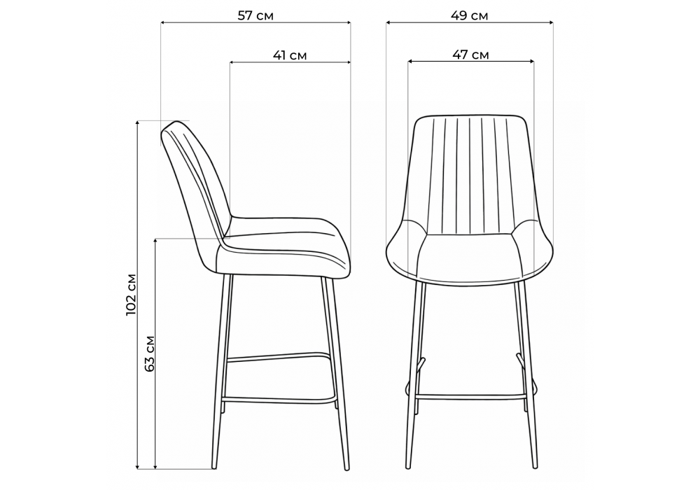 Материал каркаса - металл; Материал сиденья - велюр; Материал обивки - велюр; Ширина - 49; Глубина - 57; Высота - 102; Ширина сиденья - 47; Глубина сиденья - 41; Высота сиденья - 63;