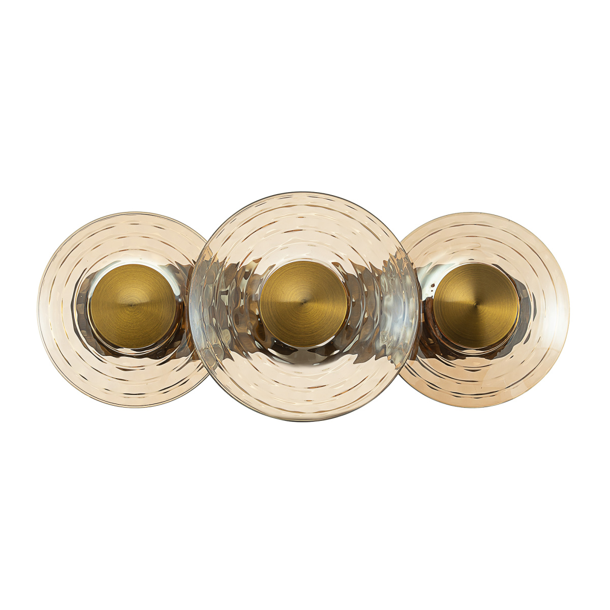 Корпус изготовлен из металла модного оттенка латуни. Круглые плафоны двух диаметров (13 и 15см) из стекла с насыщенной янтарной тонировкой закреплены в ряд на металлическом основании. Мощность изделия составляет 18Вт.