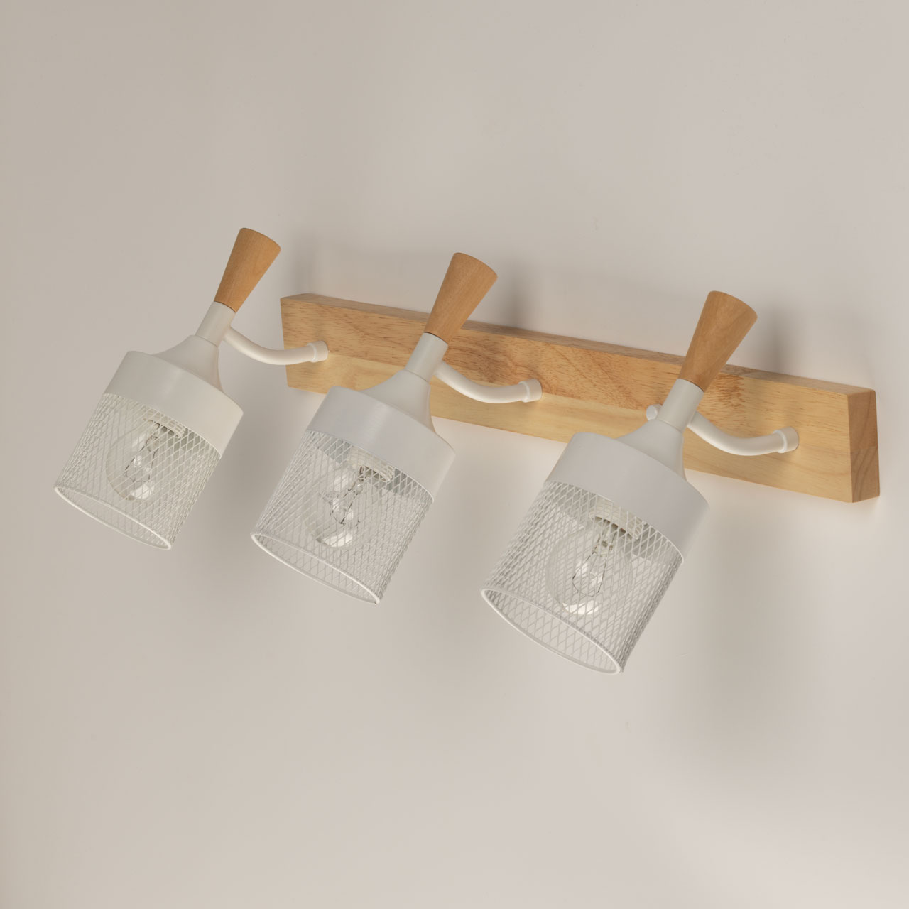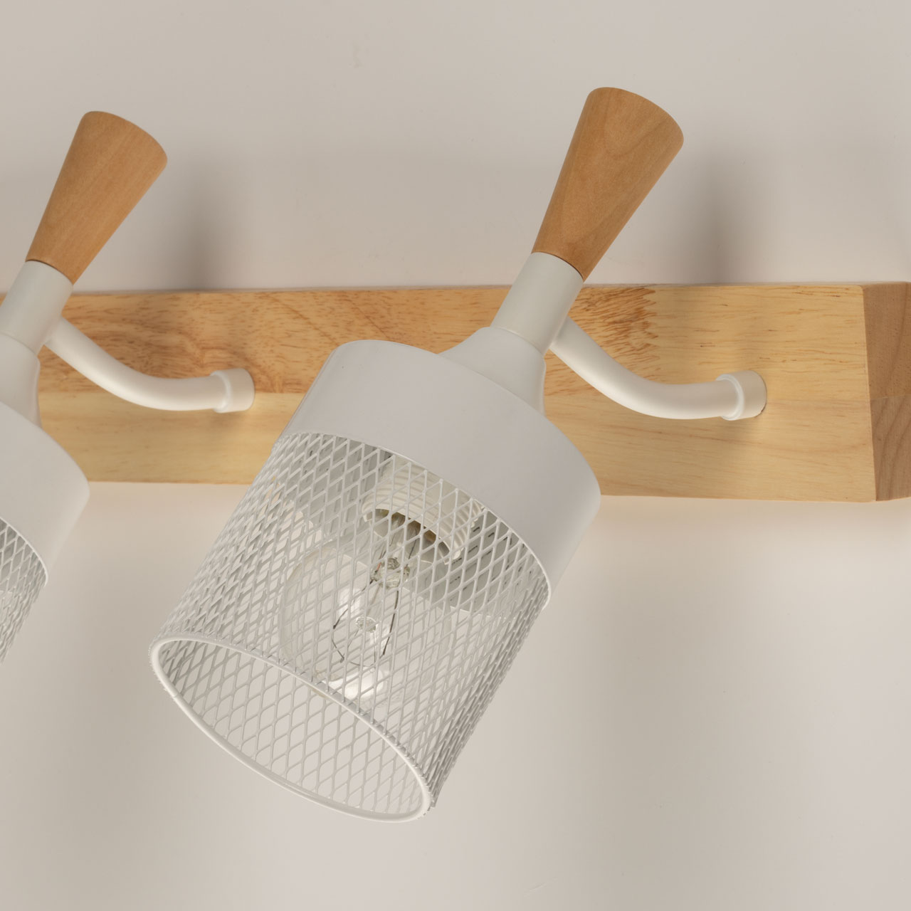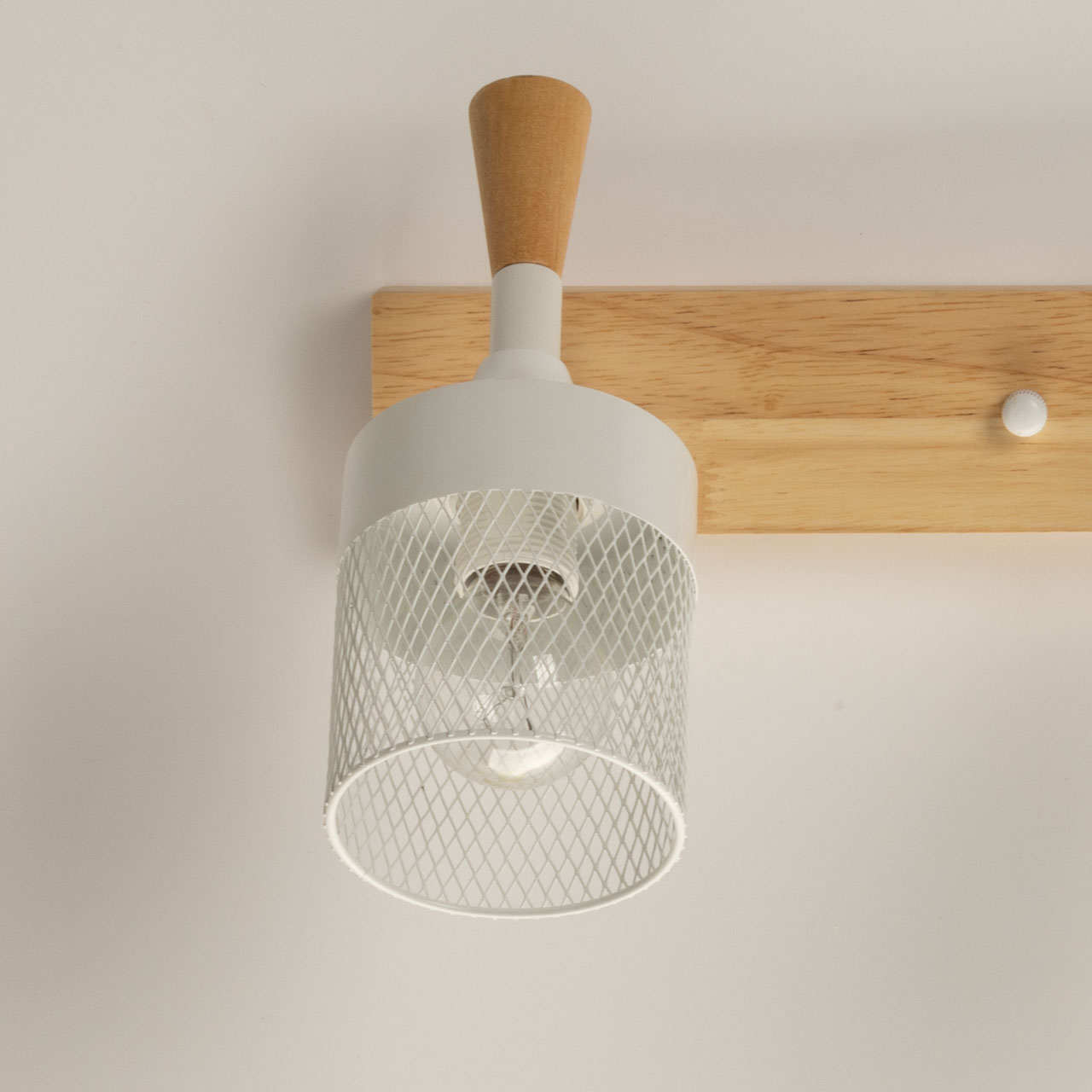 Металлические основание и плафоны настенного бра окрашены в белый цвет. Элемент крепления к стене и декор выполнены из натурального дерева.