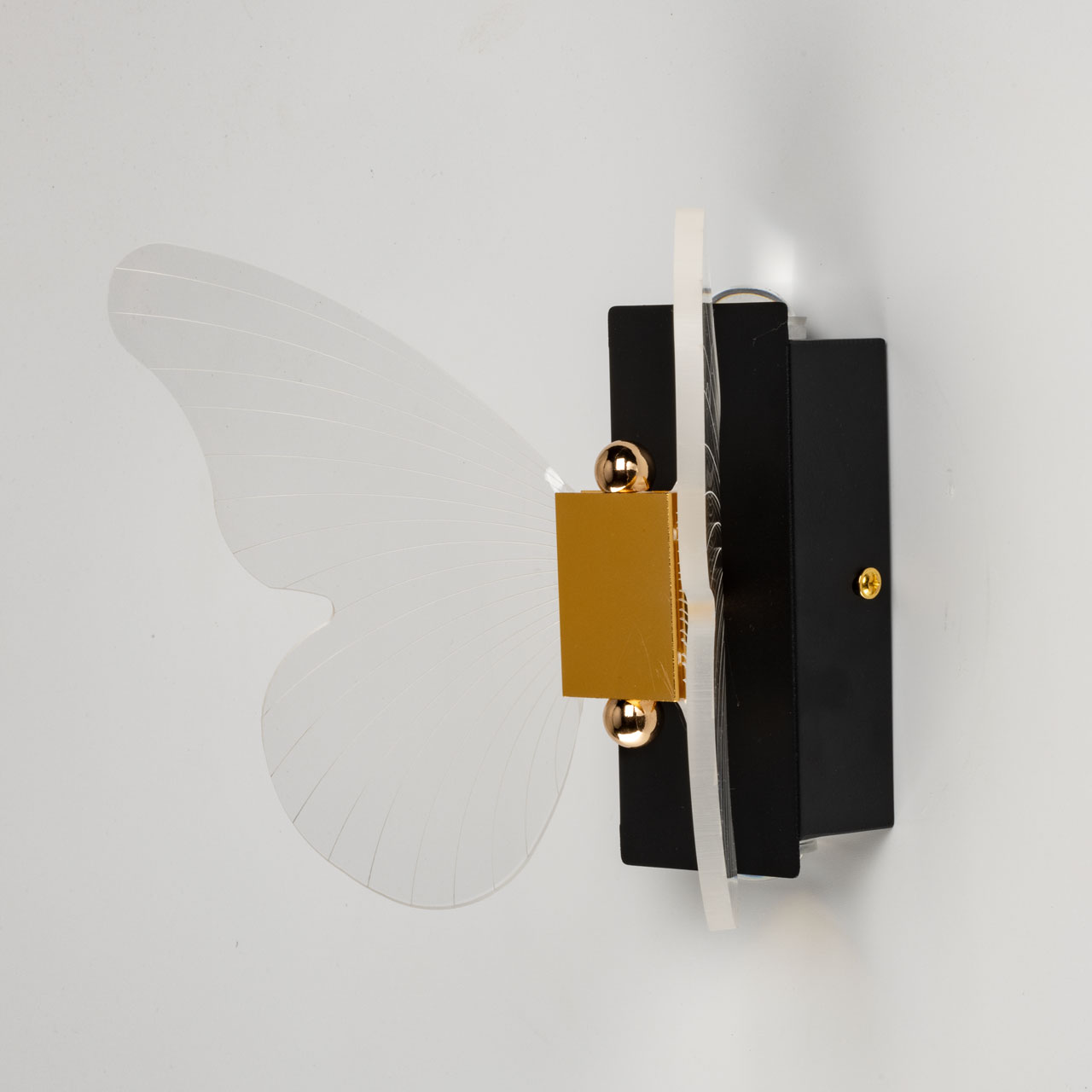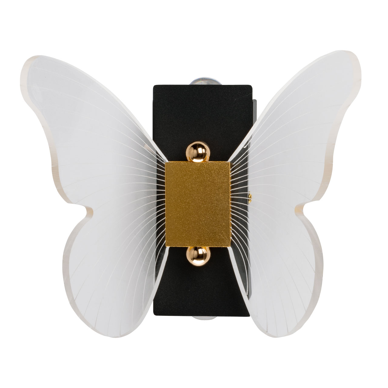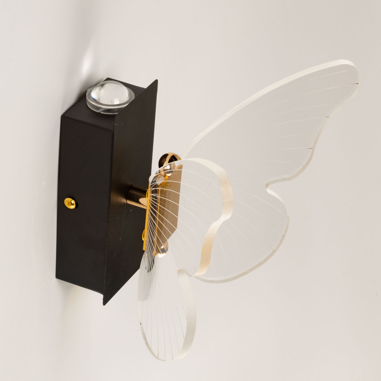 Металлический корпус настенного бра окрашен в черный цвет. Корпус плафона выполнен из сплава алюминия и окрашен в цвет золота. Настенное бра декорировано изящным элементом из прозрачного акрила в виде крыльев бабочки с линейной фактурой.