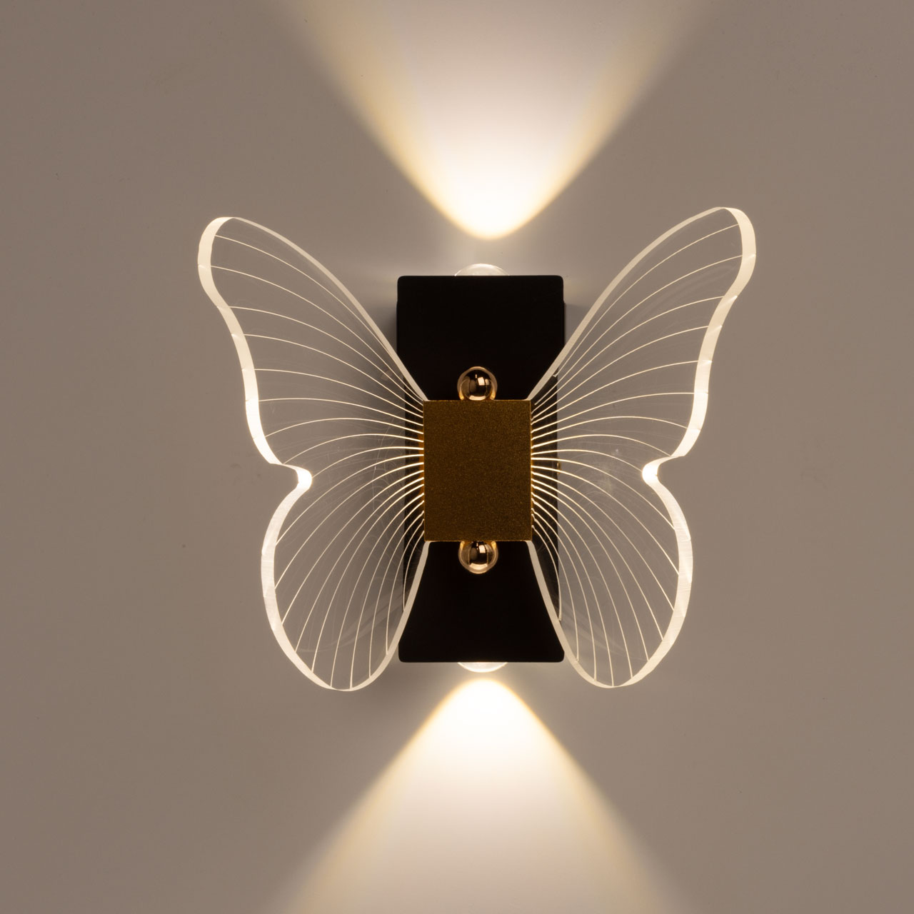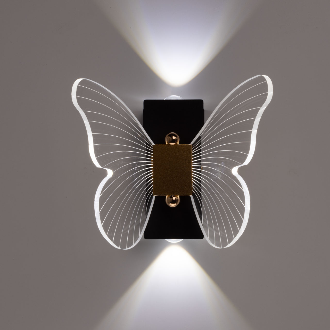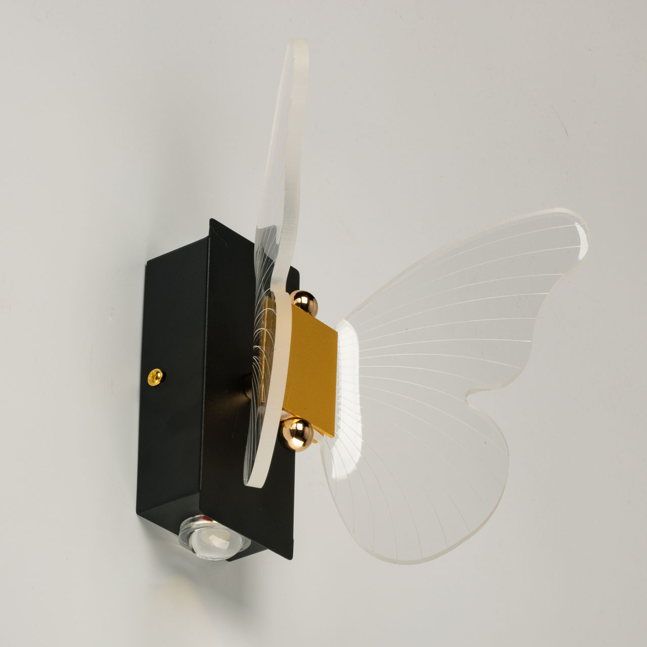 Металлический корпус настенного бра окрашен в черный цвет. Корпус плафона выполнен из сплава алюминия и окрашен в цвет золота. Настенное бра декорировано изящным элементом из прозрачного акрила в виде крыльев бабочки с линейной фактурой.