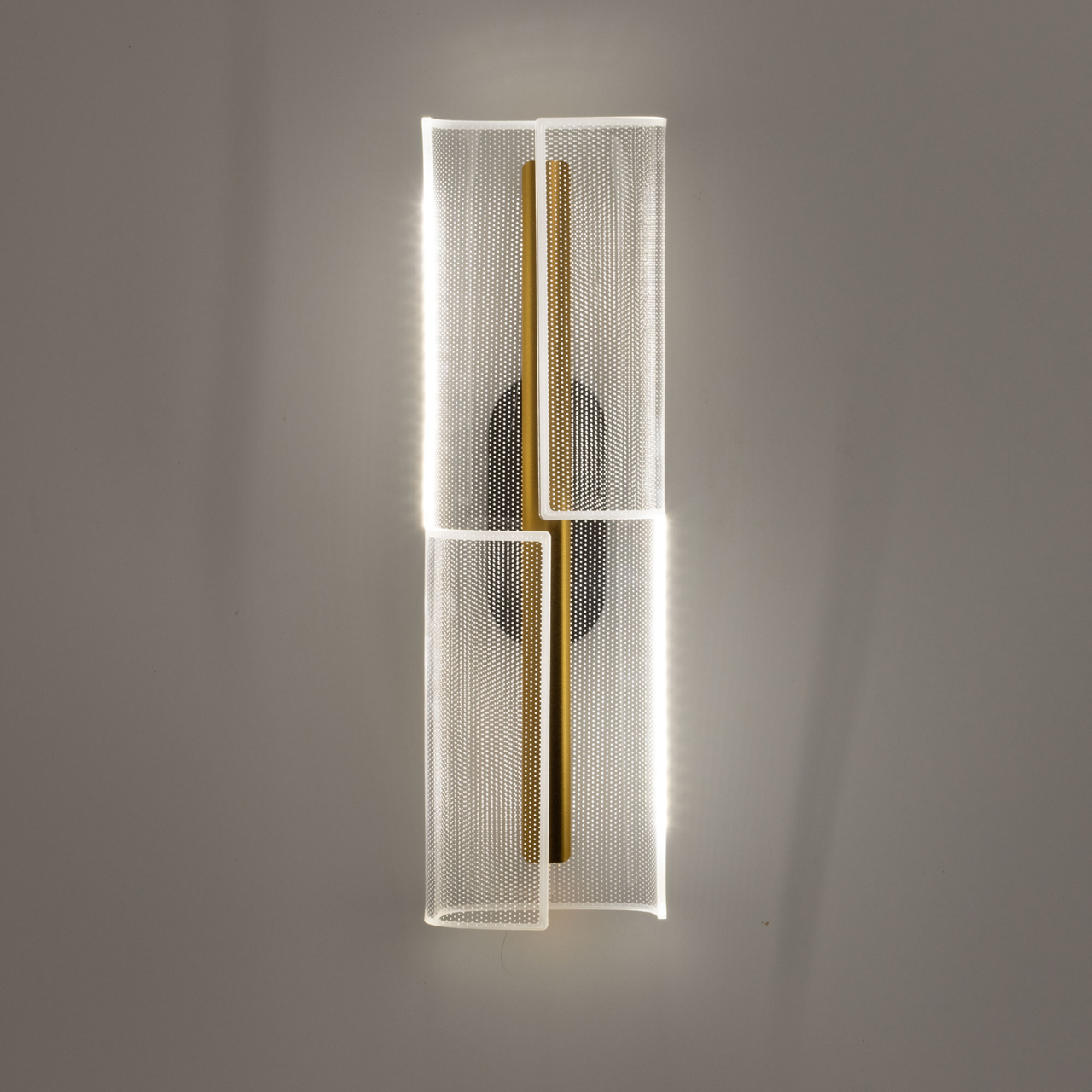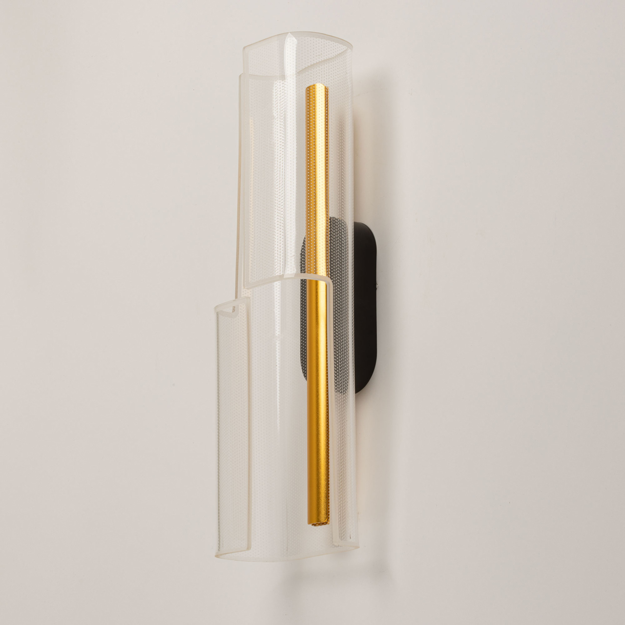 Металлический корпус настенного бра окрашен в черный цвет. Корпус плафона выполнен из сплава алюминия и окрашен в цвет золота. Настенное бра декорировано изящным элементом из прозрачного акрила с точечным рисунком.
