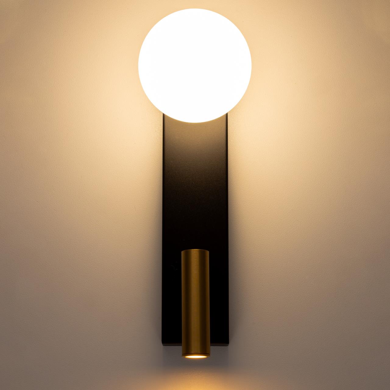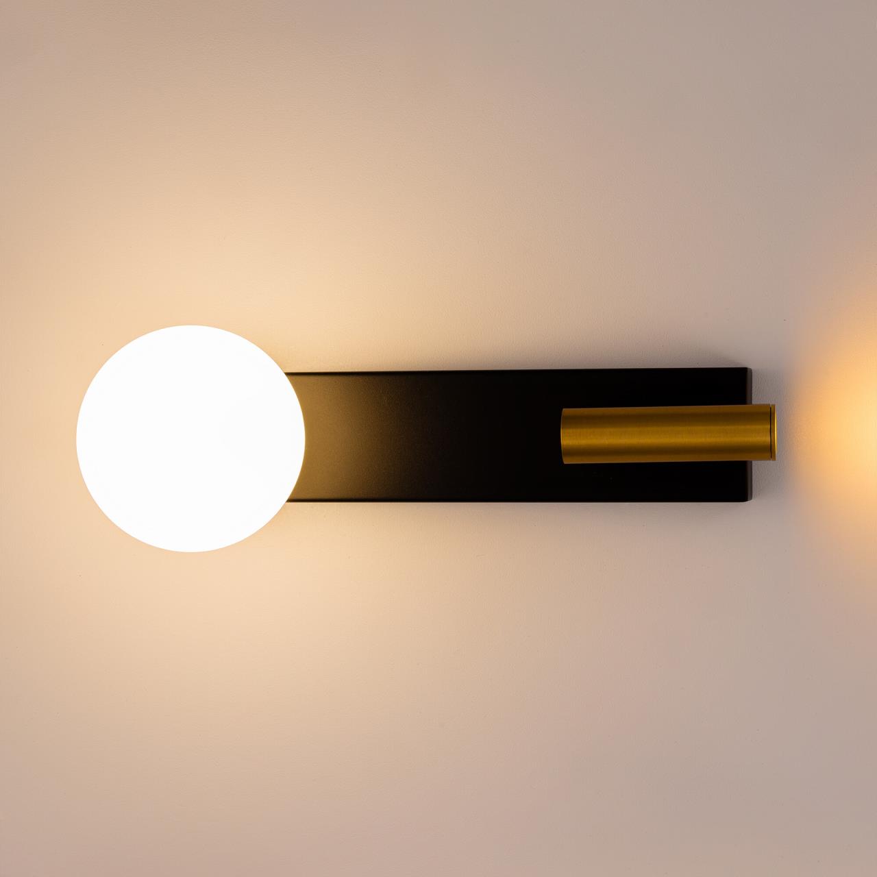 Светильник оснащен двумя источниками света: плафон в форме шара, из матового оптического полимера, для мягкого общего освещения и поворотный светодиодный модуль бронзового цвета для направленного акцентного света.