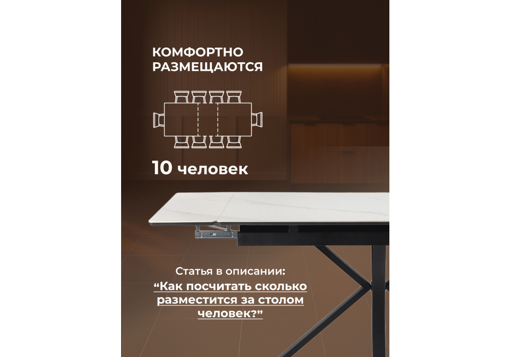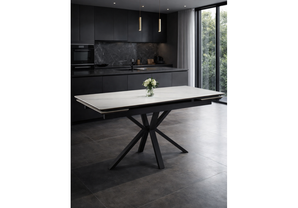 Материал каркаса - металл; Материал столешницы - Керамика; Цвет ножек - черный; Ширина - 80; Высота - 75; Длина стола в разложенном виде - 200; Длина - 140;
