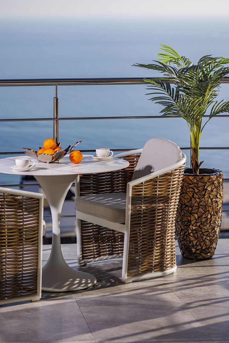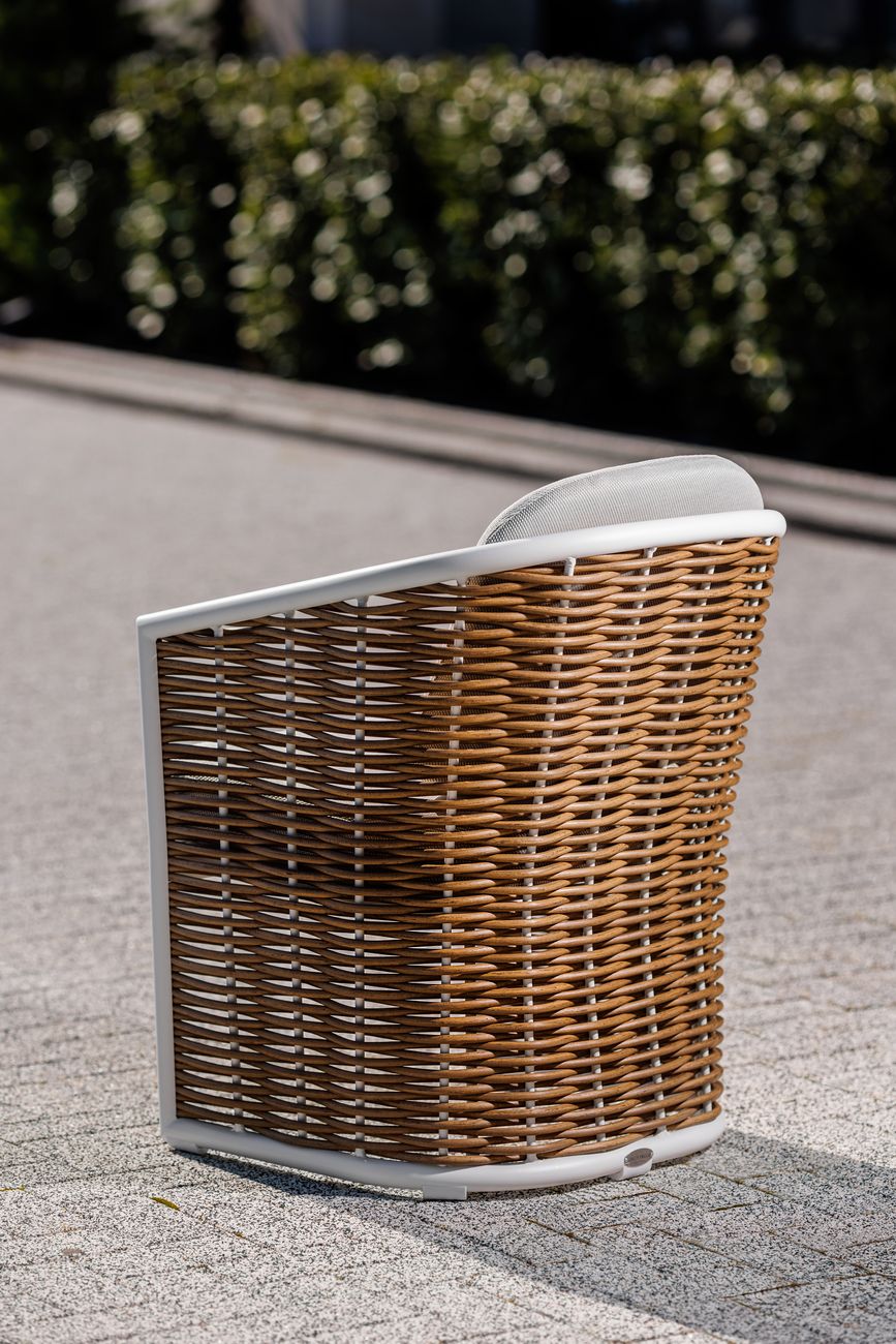 Красивое и удобное уличное кресло "Мэвис" подарит прекрасные часы отдыха на свежем воздухе. Сварной алюминиевый каркас, окрашенный в белый цвет по особой технологии, чрезвычайно устойчив к появлению ржавчины и сколов. Плетение из полимерной лозы выполнено вручную и защищено патентом, подушки спинки и сиденья из эксклюзивной полиэстровой ткани Wintech исключительно устойчивы к ультрафиолетовому излучению и атмосферным воздействиям, обладают высокими характеристиками водонепроницаемости, грязеустойчивы и легко моются. Вы можете оставить кресло под жарким солнцем или проливным дождем, оно будет выглядеть так же прекрасно, как и после покупки. Продукция этого производителя отмечена многочисленными международными наградами в области дизайна и индустрии гостеприимства. Габариты сиденья: ширина 55см, глубина 44см, высота 46см. В комплект входят: подушка сиденья (большая) и подушка спинки (малая). Сочетается со столом «Верона» 39AR-STOL-304 BEL.