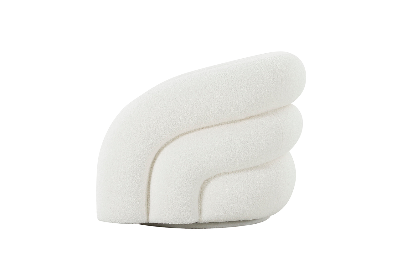 Удобное белое кресло футуристической формы выполнено из мягкой обивки, по фактуре напоминающей овечью шкуру. Оригинальные мягкие выпуклые объемы внешней части несомненно будут притягивать взор и позволят в полной мере воспользоваться преимуществами этого кресла как дизайнерского объекта, декоративного на все 360 градусов.