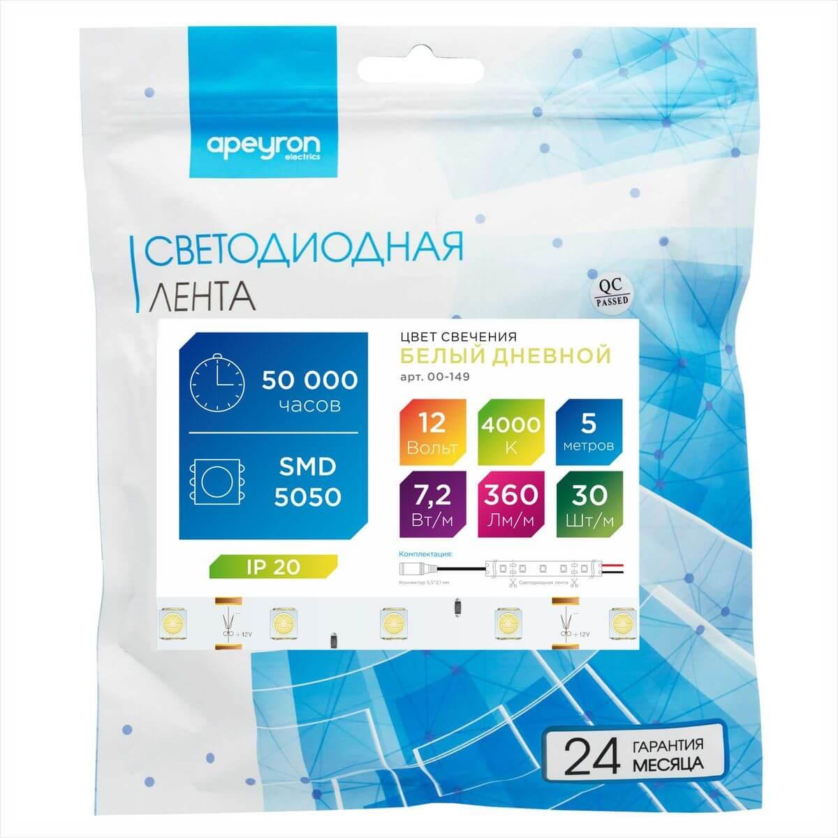 Лента Apeyron 7, 2W/m 30Led/m 5050SMD дневной белый 5M 00-149 в Иваново