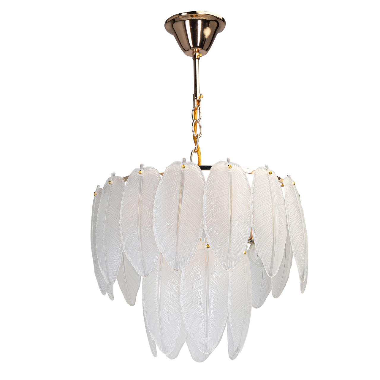Металлическое основание светильника гальванизировано в цвет золота. Люстра декорирована матированными стеклянными элементами в форме листьев.