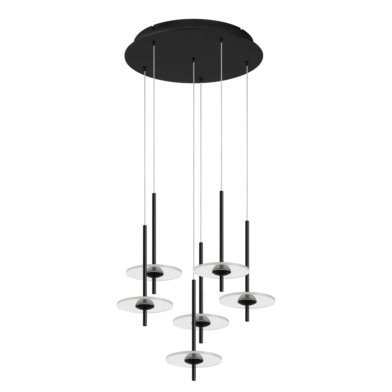 Металлическое основание подвеса обработано по технологии порошкового окрашивания в черный цвет. Плафоны в виде диска выполнены из прозрачного акрила.