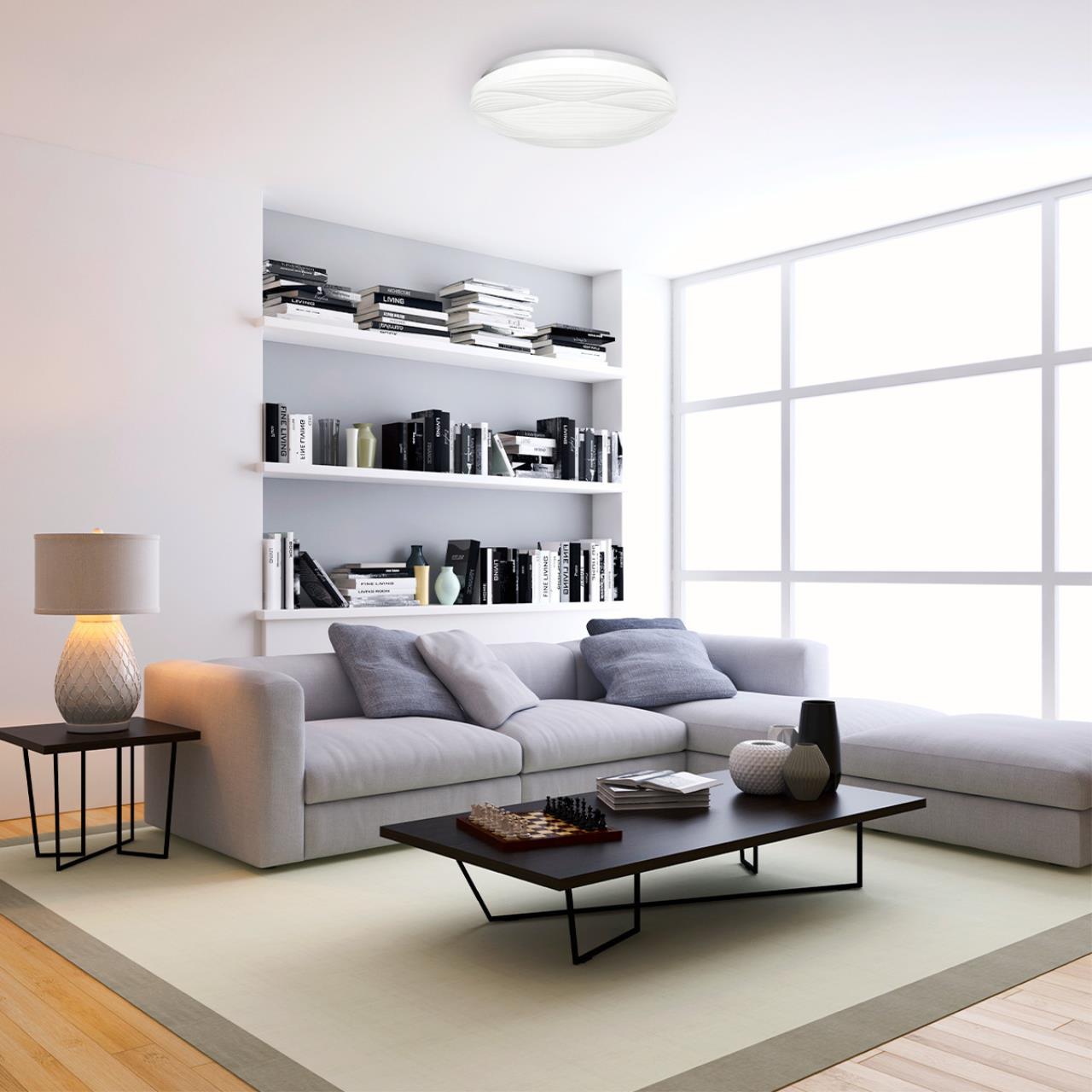 Светильник 7686/ELN линии HIMAR состоит из металлического основания (базы) и пластикового рассеивателя. Материал рассеивателя — высококачественный пластик марки PMMA 2.0 белого цвета с матовой поверхностью. Пластик обеспечивает светильнику равномерное рассеивание и хорошее светопропускание. Форма плафона: круглая, декорирована рельефом из пластика в виде узора белого цвета. Степень защиты IP43 позволяет использовать светильник в определенных зонах влажных помещений. В комплект входит LED-модуль с линзами мощностью 76 Вт, соответствующей лампе накаливания 740 Вт, а также переключатель температуры цвета (ССT) на драйвере, с помощью которого осуществляется изменение цветовой температуры 3000/4000/6000 К и переход светильника в режим теплого/белого/холодного света. Для установки необходимого режима рекомендуется использовать удлиненный тонкий предмет типа небольшой отвертки.