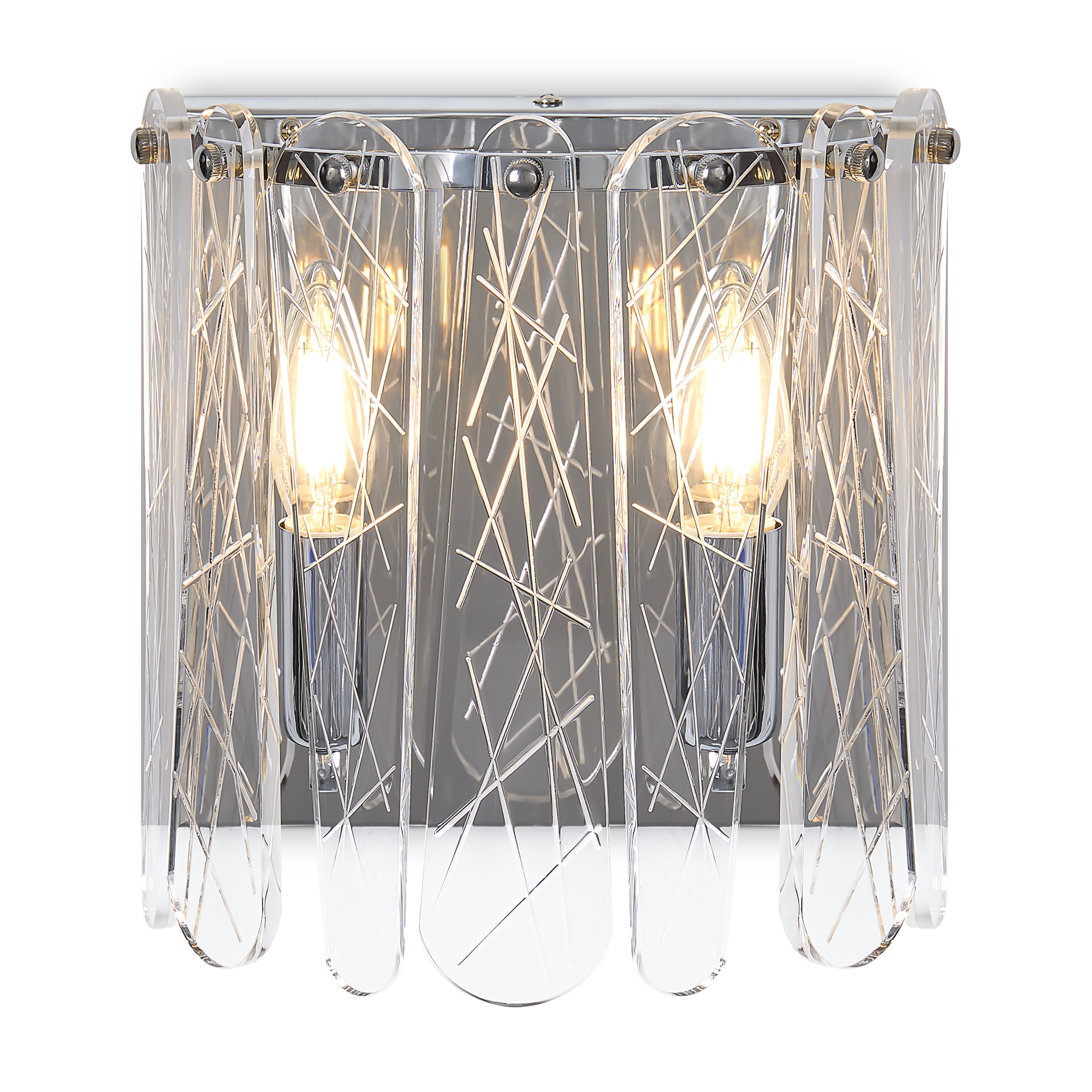Материал арматуры — металл, цвет — хром. Светильники выполнены из хрусталя с рисунком "frozen". Подвесные светильники и бра с цоколем E14. Современный дизайн арматуры, дугообразные формы с хромированной отделкой подчеркивают декоративные хрустальные элементы. Подходит для современных интерьеров. Данную модель FR2048WL-02CH с быстрой доставкой спешите купить в магазине 220svet.ru
