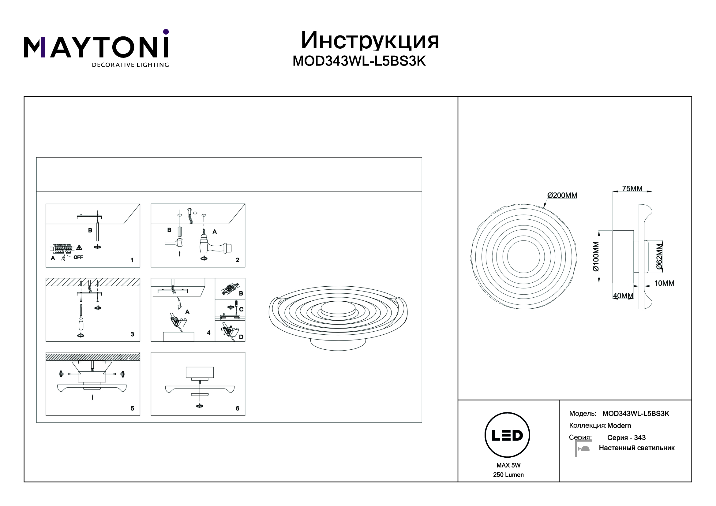 Данную модель MOD343WL-L5BS3K с быстрой доставкой спешите купить по цене 10 050 ₽ в магазине 220svet.ru