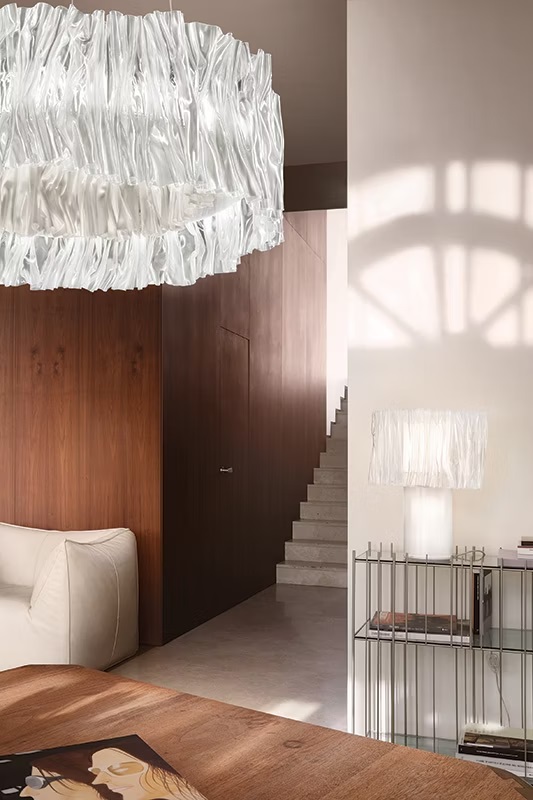 Коллекция Accordeon представляет собой новое повествование в современном дизайне: эксклюзивный материал Lentiflex® от Slamp нагревается и формуется вручную женщинами, создающими свет по индивидуальному заказу. Каждая деталь уникальна, но лампы идентичны. На тонкой стальной табличке сбоку каждой лампы написано «Ручная работа в Италии», что свидетельствует об уникальном дизайне продукта. Лампа имеет два переключателя, один для абажура, а другой для основания. Оба источника света можно использовать вместе, создавая равномерное свечение и силуэт, напоминающий хлопок. Абажур и патроны настольной лампы снабжены магнитами, облегчающими чистку и замену ламп.