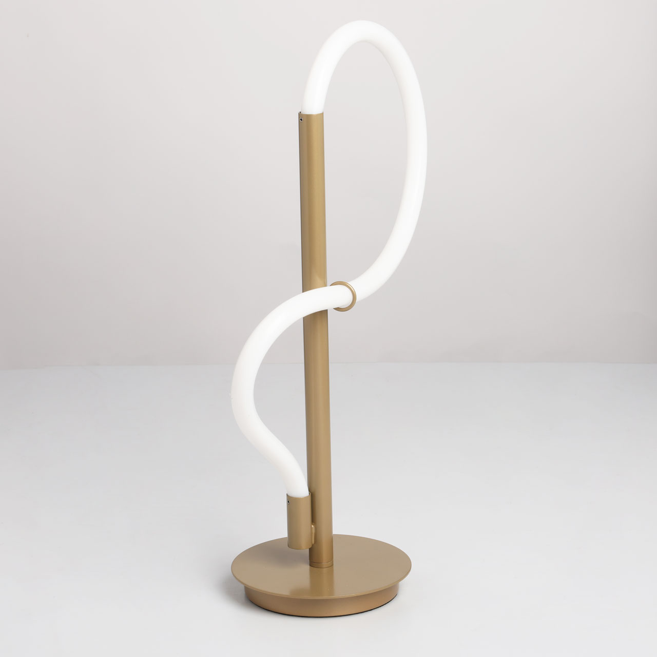 Металлическое основание настольной лампы окрашено в цвет перламутрового золота. Гибкий плафон настенного бра выполнен из белого матового силикона.