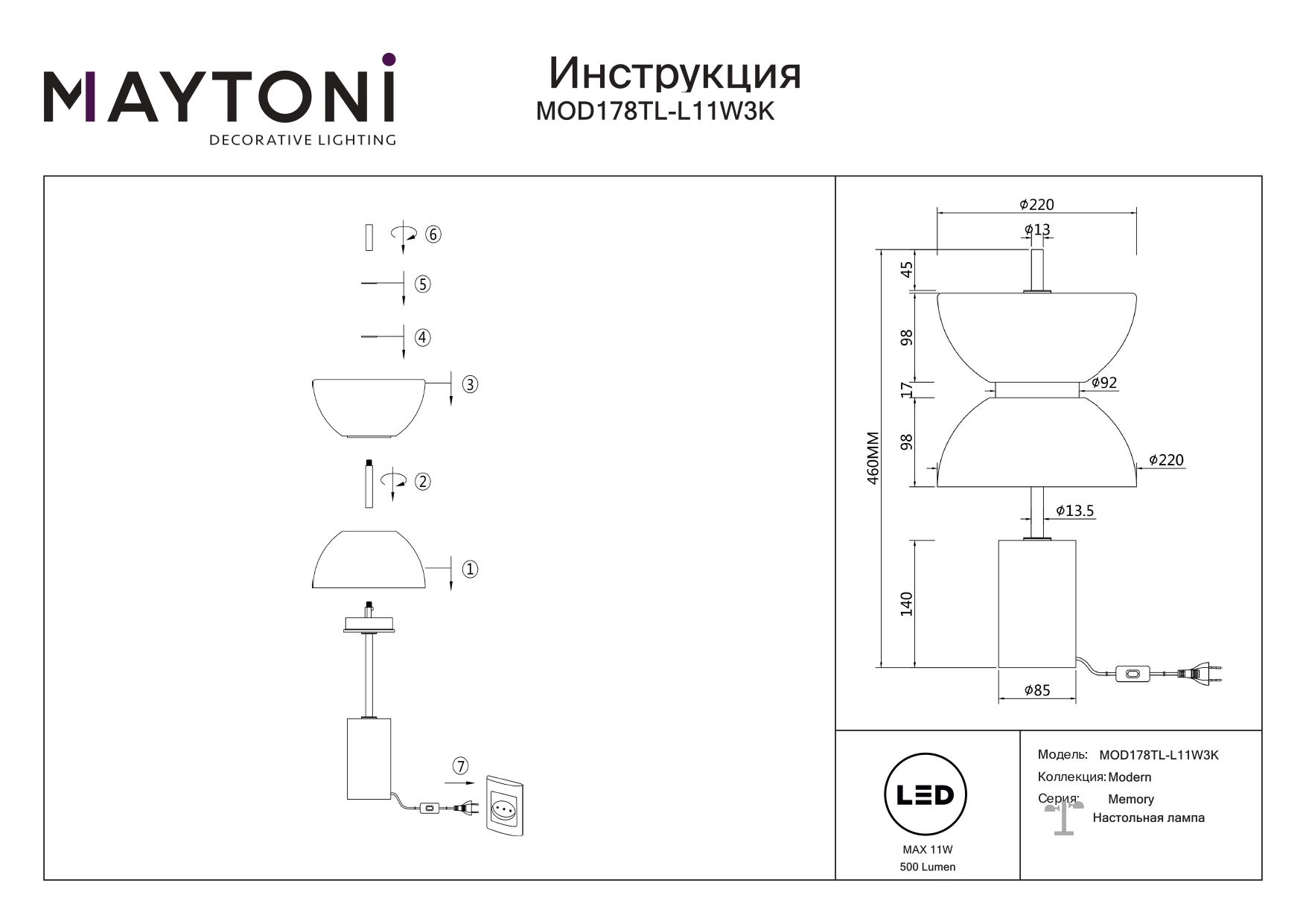 - Общая мощность: 11 W