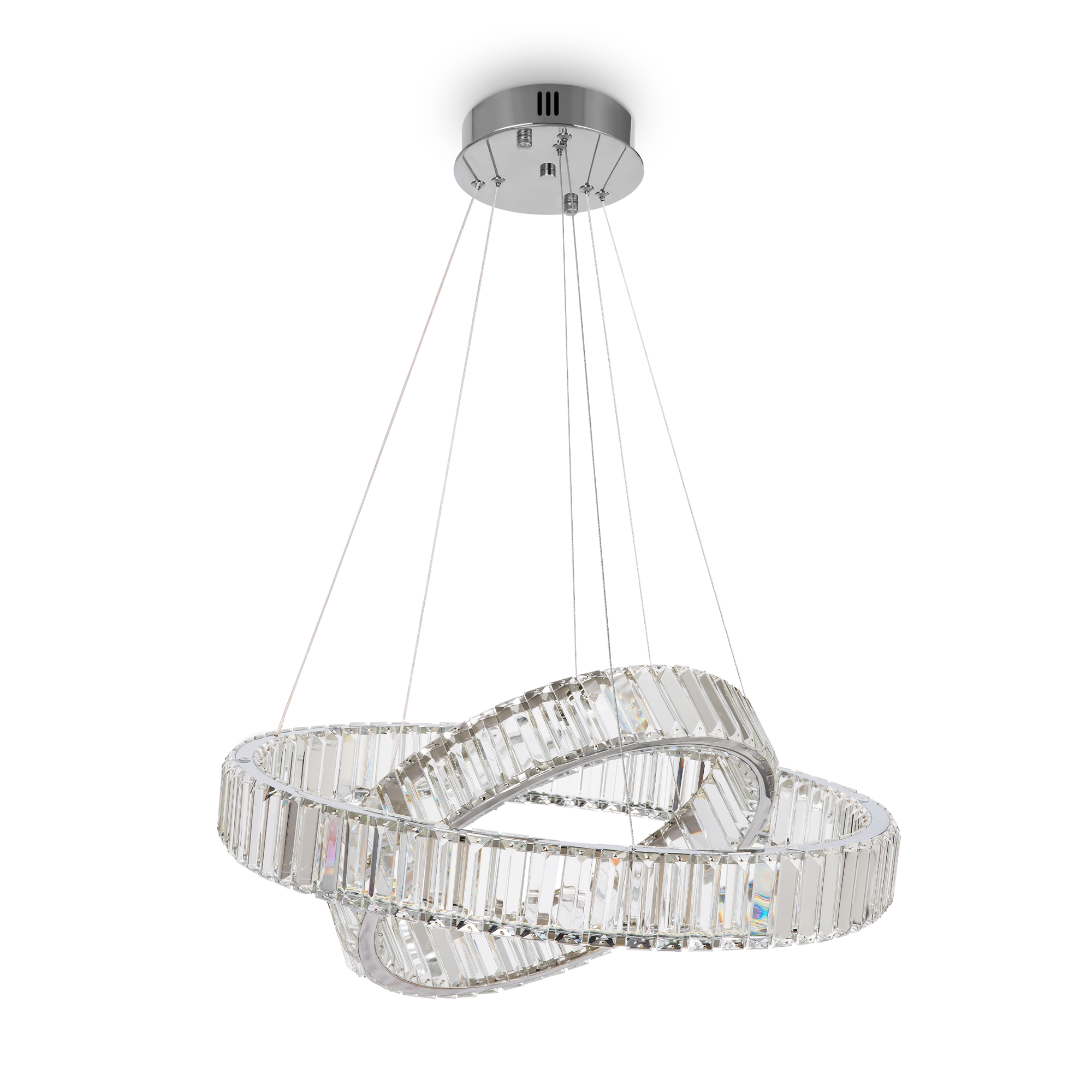 Металлическая арматура в цвете латунь и хром. Хрустальные декоративные кольца с геометричными гранями. LED-источник света. Регулировка цветовой температуры (3000-4000-5000K) и яркости 4G-dimming при помощи пульта (в комплекте).