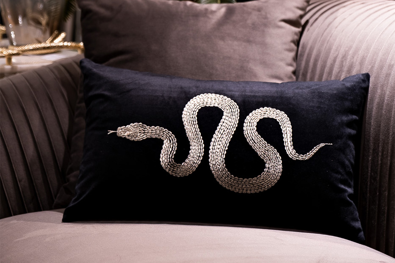 В этой декоративной черной подушке представлен значимый символ мудрости и домашнего очага – грациозная змея. Серебристая змея на черном фоне привлечет в ваш дом достаток, уют и гармонию. Диванная декоративная подушка станет ярким штрихом в интерьере гости. Материалы: полиэстер, хлопок