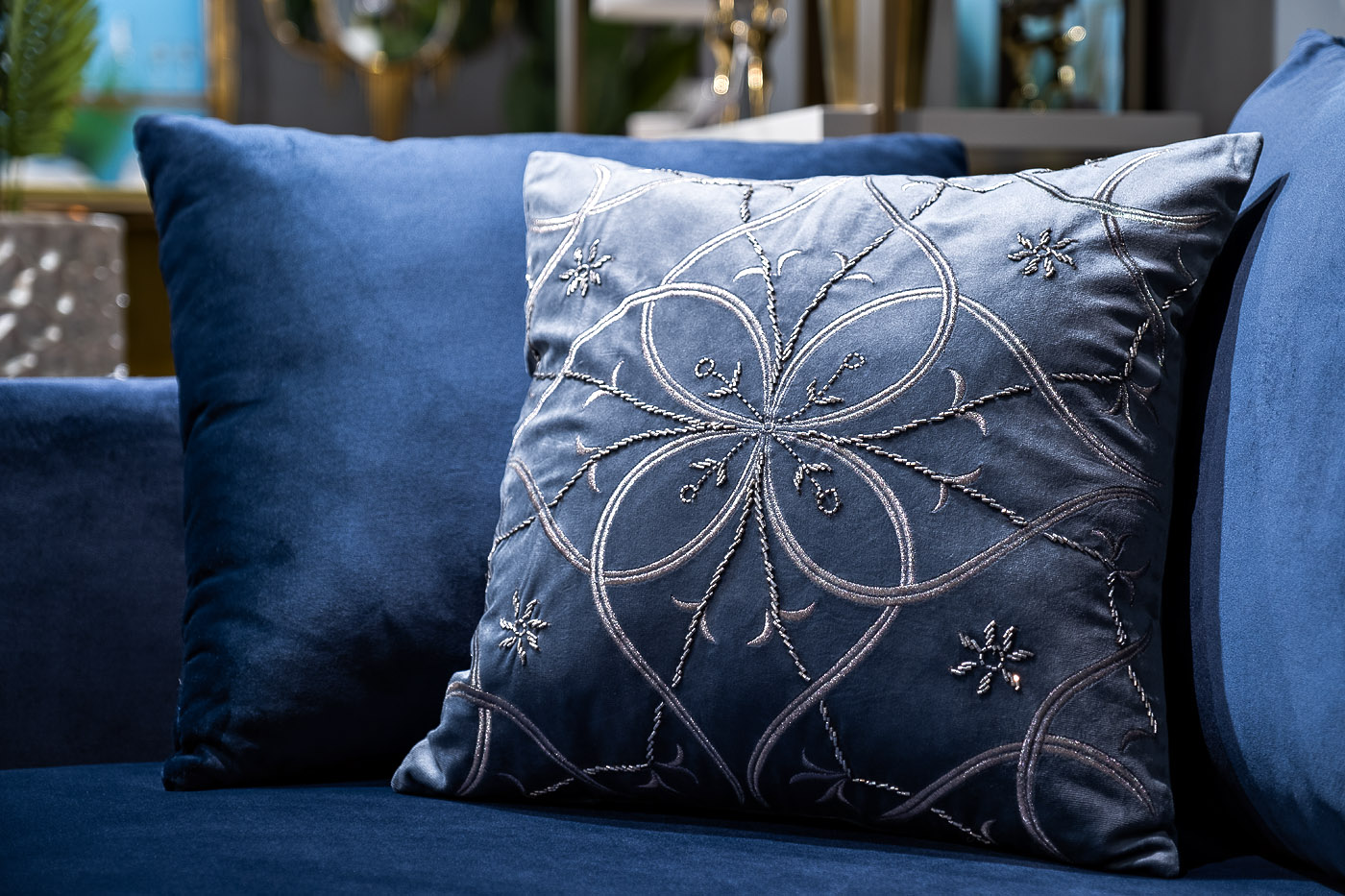 Обратите внимание на декоративную подушку с вышивкой в насыщенном синем цвете, обрамленную оригинальным узором из бисера и серебристых нитей. Бисер – материал для декора вне времени, актуальный для ценителей роскоши и вещей, декорированных вручную. Эта декоративная подушка с узором станет достойным украшением интерьера любого стилевого направления – от классического до современного. Сочетайте изделие с мягкой мебелью синего цвета других оттенков и вы получите роскошный интерьерный комплект, воплощающий умиротворение, богатство, и изысканность.