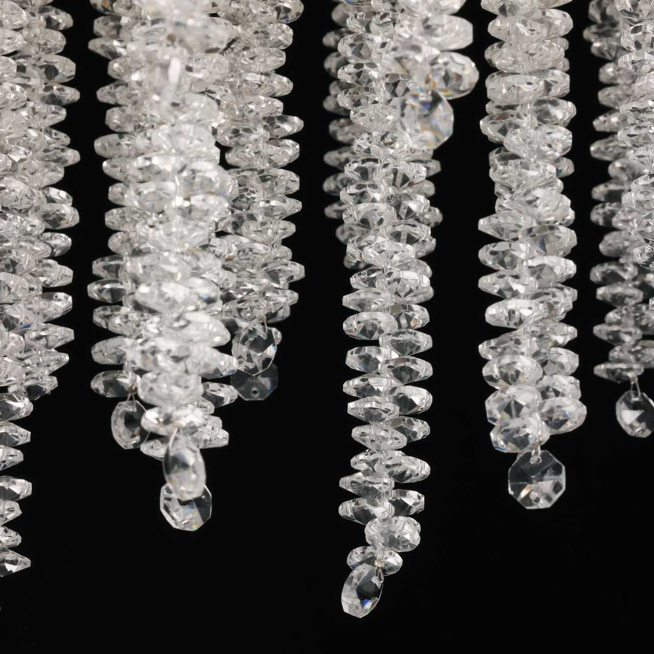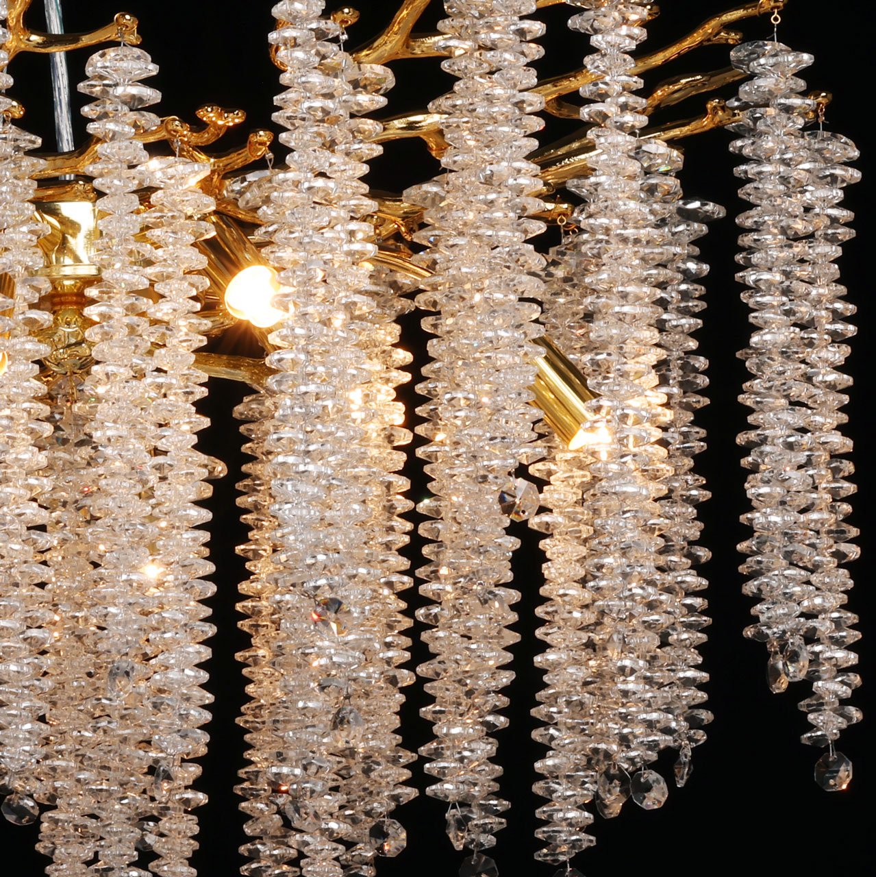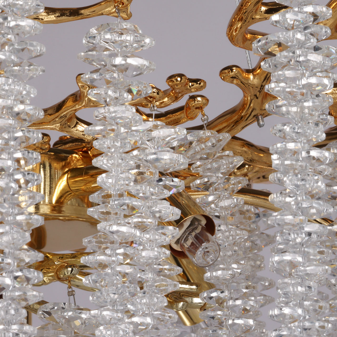 Основание подвесной люстры выполнено по технологии художественного литья из сплава алюминия с цинком и гальванизировано в цвет золота. Люстра декорирована гроздьями из прозрачного хрусталя. Потолочная чаша декорирована фактурной чеканкой.