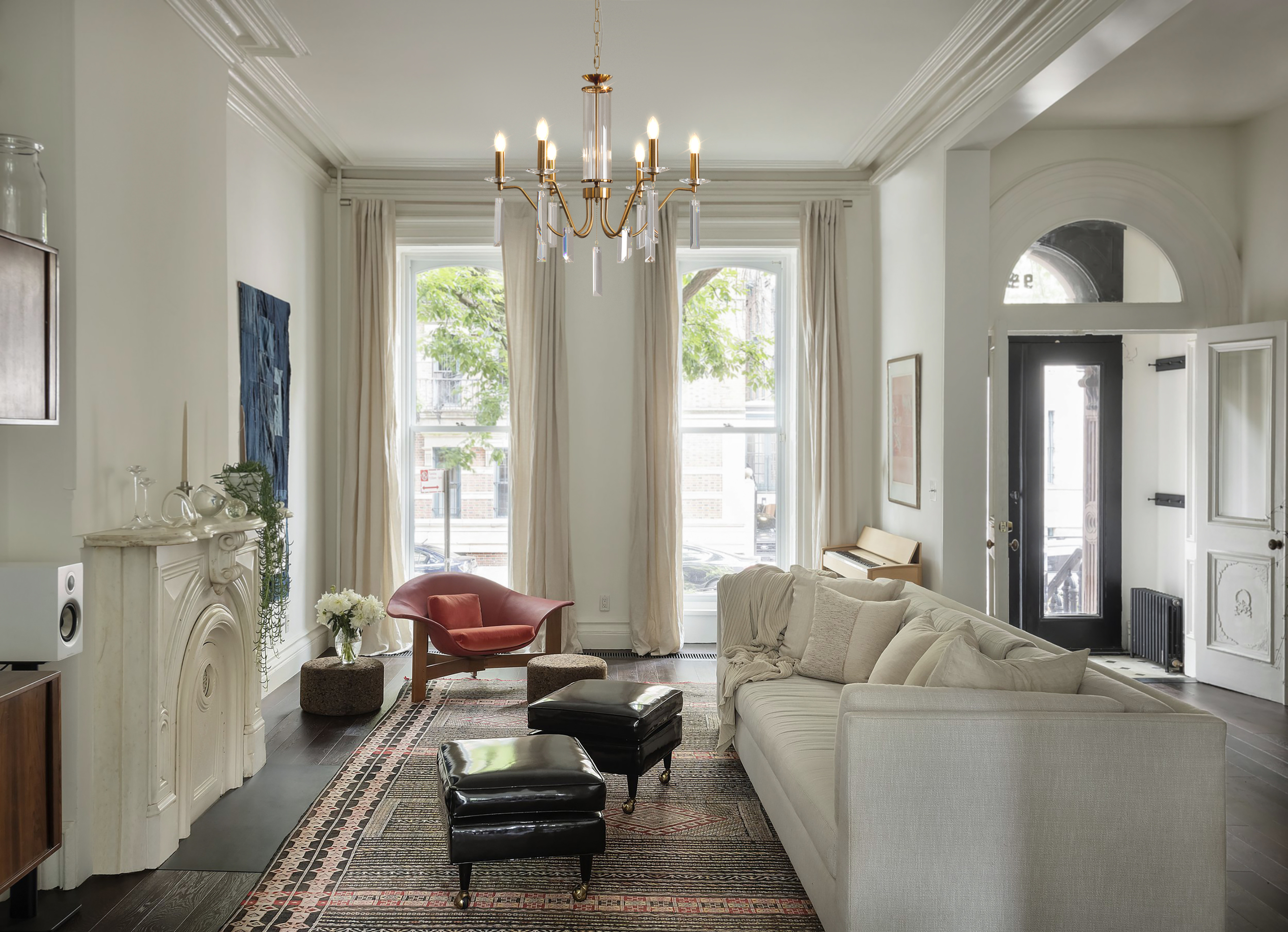 Материал арматуры — металл, цвет — никель или латунь. Подвесные светильники с цоколем E14. Доступны с пятью или шестью источниками света. Грани хрустальных подвесов создают эффект перелива радуги. Центральный декор из стеклянных трубок. Подходит для классических интерьеров.