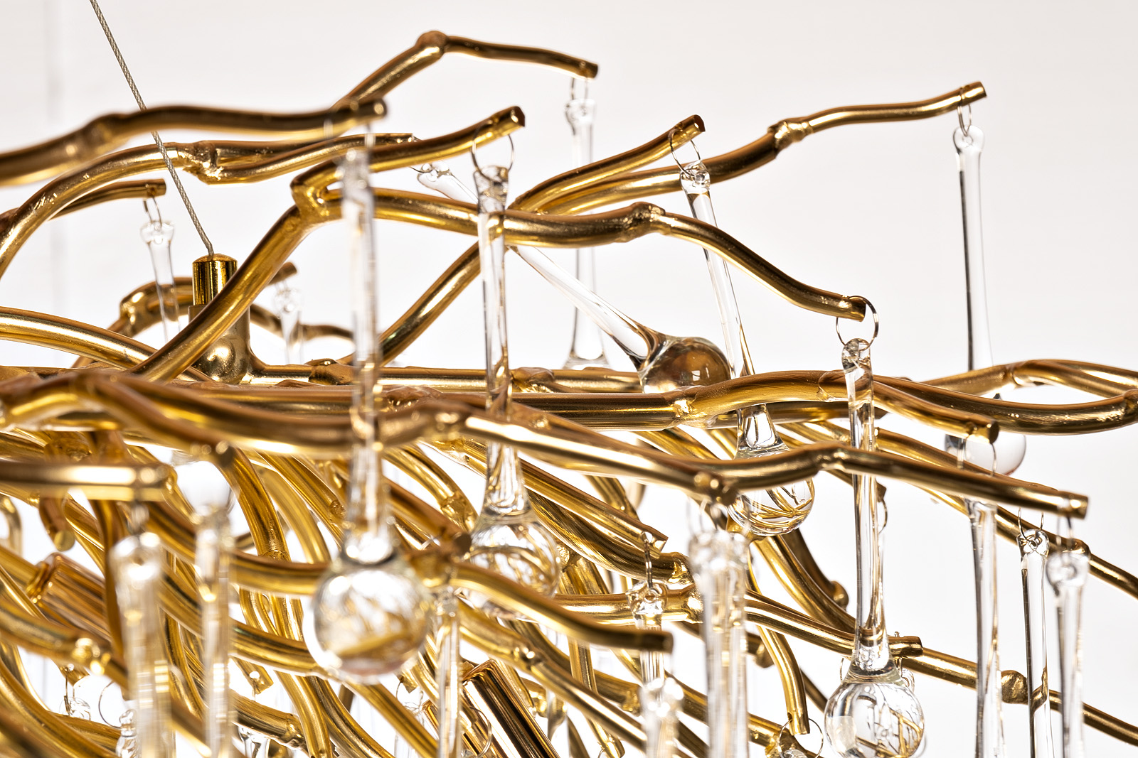 Эта великолепная люстра сочетает в себе изящество природы и современные дизайнерские решения. Золотистое основание напоминает запутанные ветви дерева, с которых свисают прозрачные капли, создавая эффект дождя из прозрачного стекла. Люстра излучает мягкий свет, наполняя пространство атмосферой роскоши и тепла. Подходит для установки в гостиной или столовой. Эта люстра станет выразительным акцентом в интерьере, привлекая внимание и восхищение.