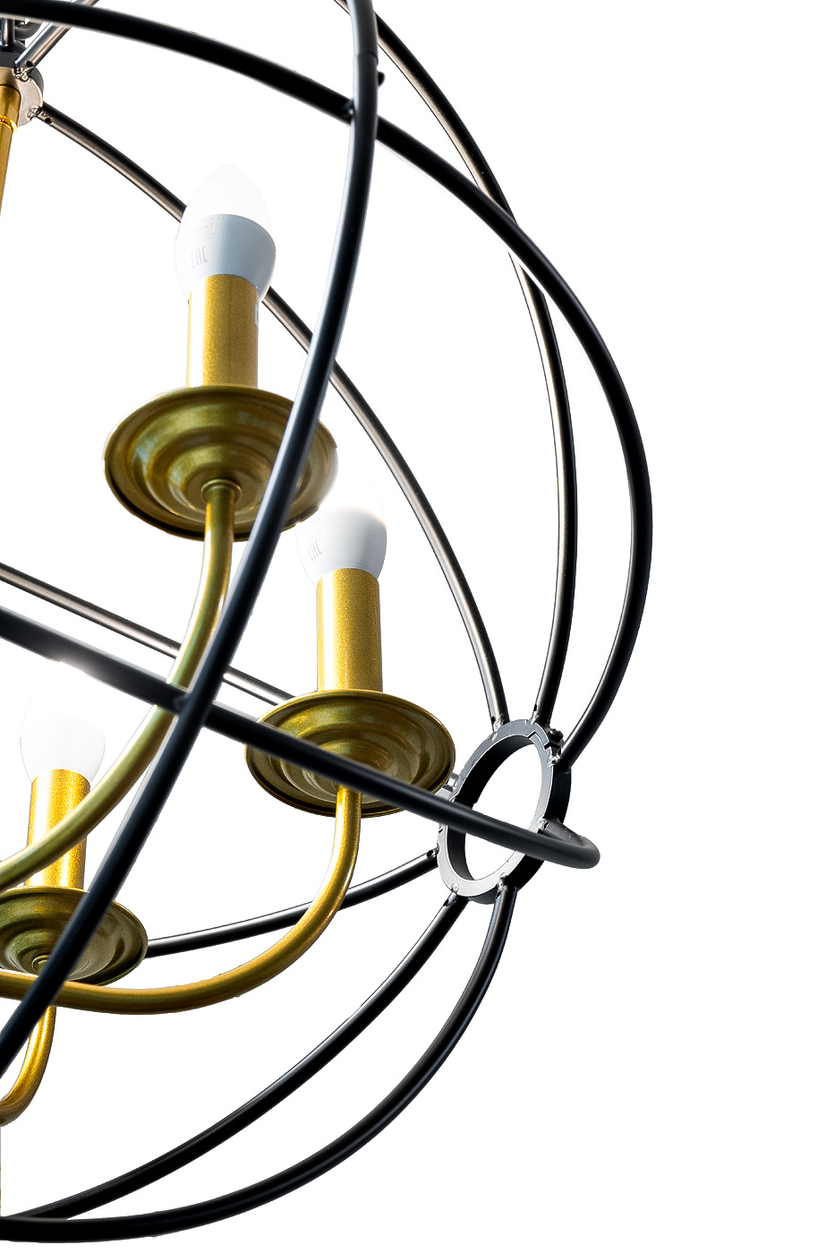 Графичная и эффектная дизайнерская люстра сделает вашу кухню, столовую или гостиную необыкновенно выразительной. Оригинальные патроны для лампочек в виде золотых подсвечников заключены в ажурную сферу из черного металла. Контрастное сочетание черного и золотого цветов, изящные аллюзии на старинные замковые светильники в комбинации с современным исполнением делают интерьер ярким, модным и необычным. Рекомендованная площадь освещения - 12-18м2