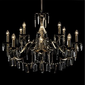 Люстра с комбинированным металлическим основанием, покрытым золотом в 24 карата. Подвески из хрусталя цвета латуни. Дизайн ламп в виде свечей, они выполняют функцию плафонов. Расположенные на разных уровнях лампы помогают создать объемный свет в помещении. Крепление осуществляется на крюк. Можно изменять высоту за счет укорочения цепи. Подойдет для просторных помещений с высокими потолками.