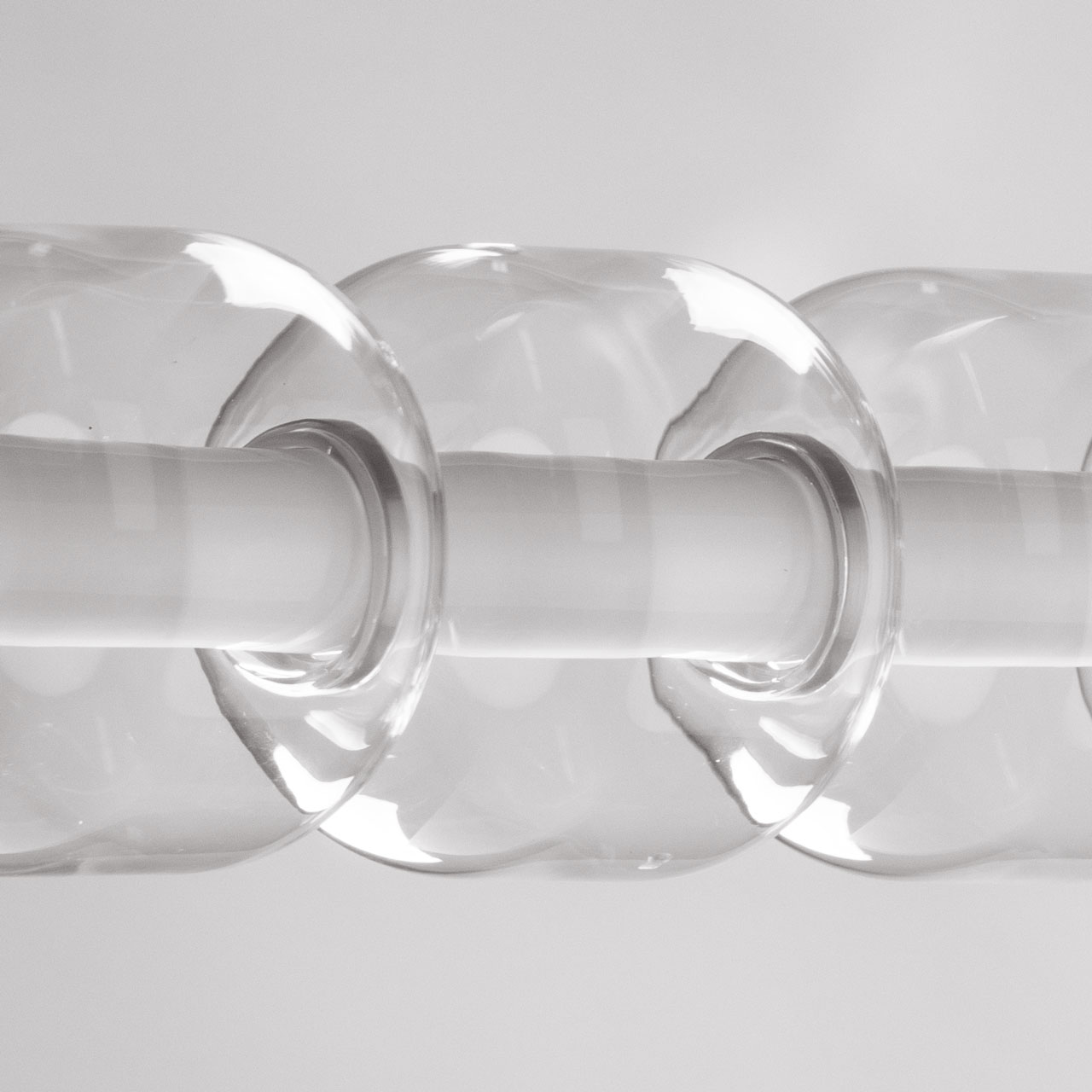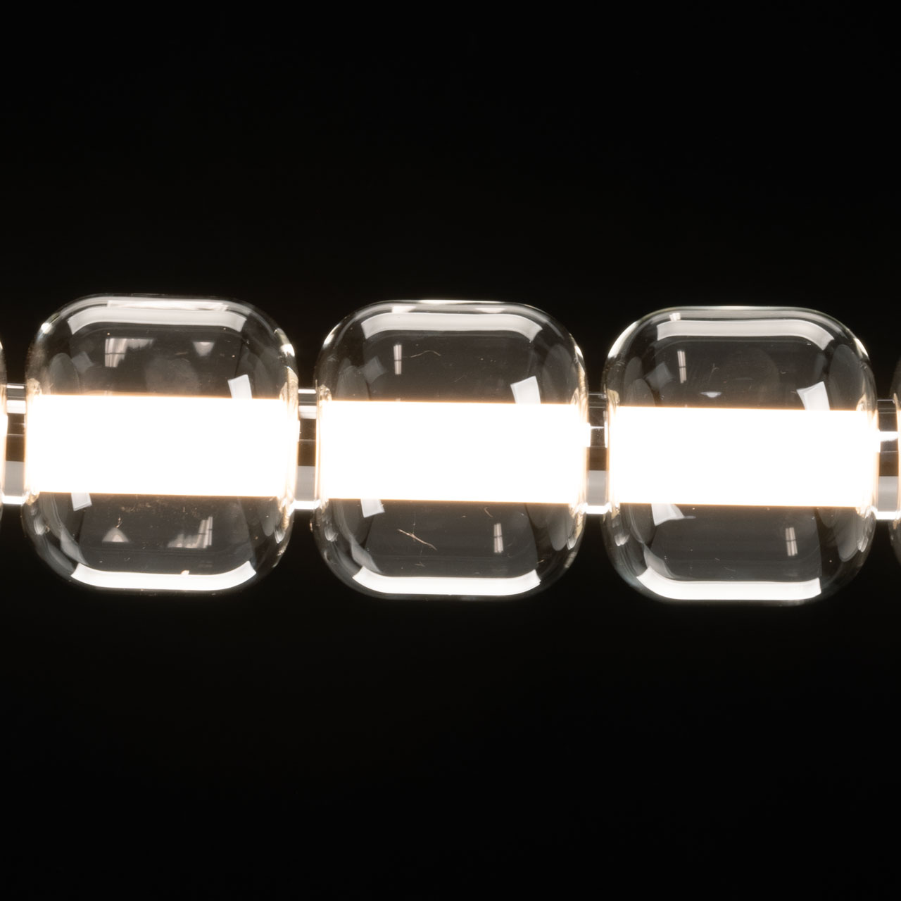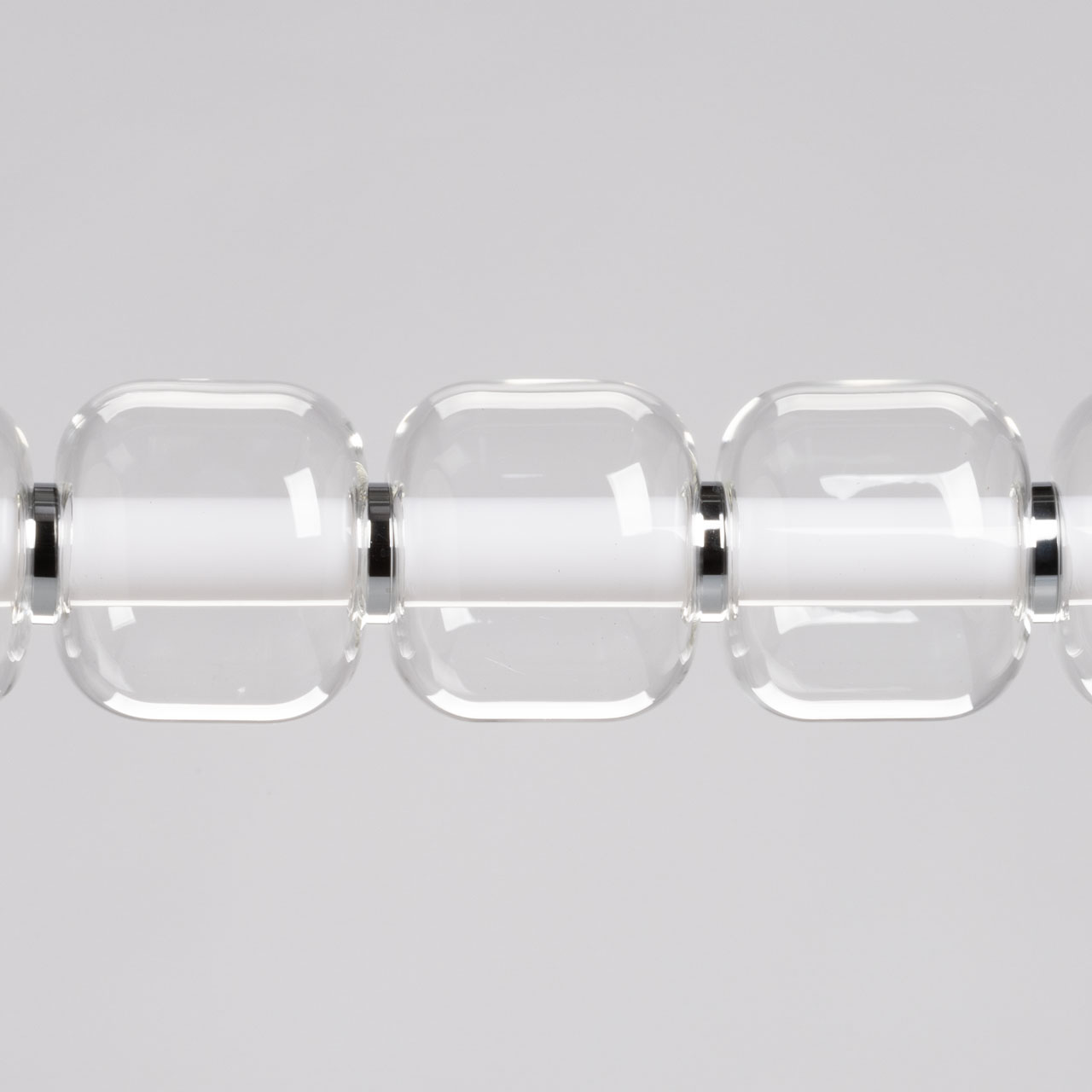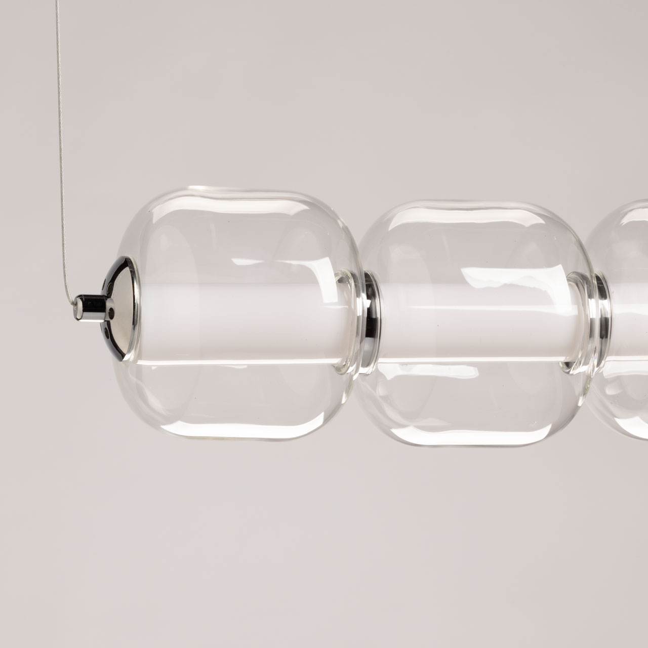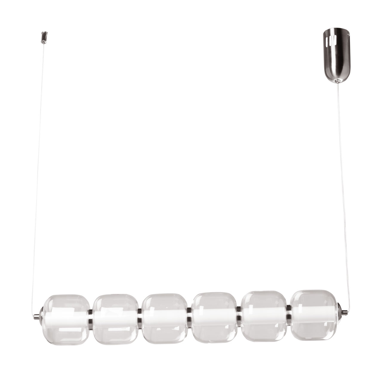 Металлическое основание гальванизировано в цвет хрома. Светодиодные источники света закрыты белым матовым акрилом. Светильник декорирован прозрачными стеклянными плафонами.