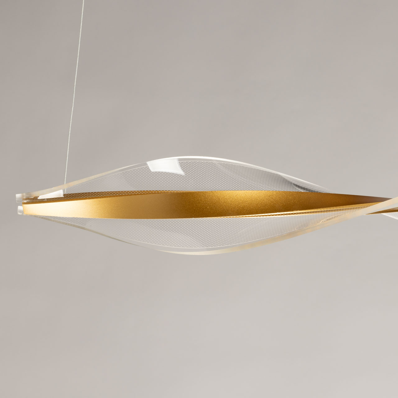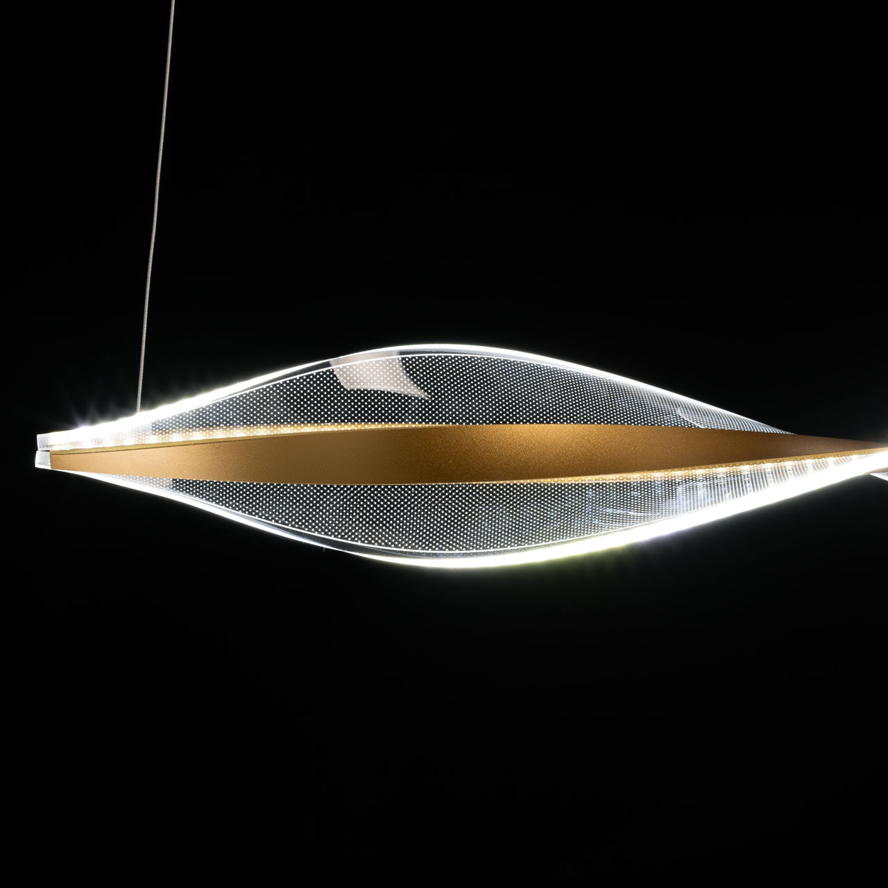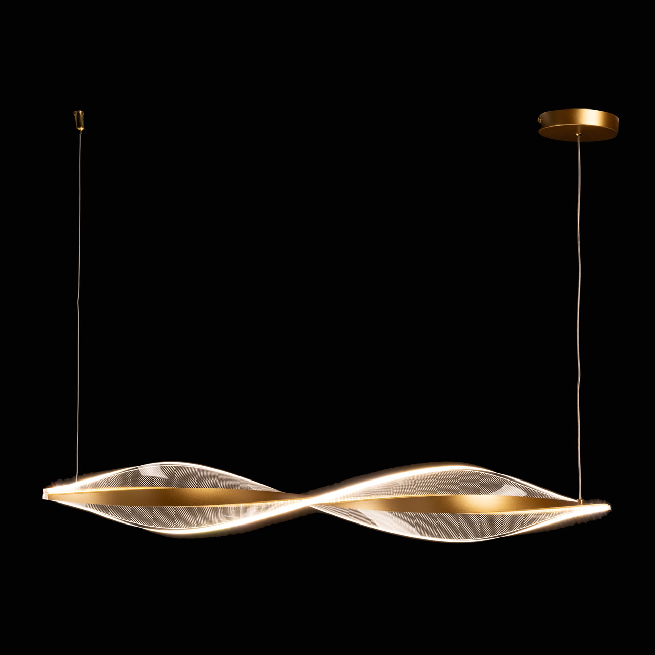Благородный цвет золота эффектно сочетается с минималистичным дизайном подвесной люстры. Материал корпуса плафона эффективно отводит тепло от светодиодов, продлевая их срок службы. Оригинальный плафон волнистой формы из прозрачного акрила с точечным рисунком обеспечивает приятное и равномерное освещение. Многорежимность освещения от 3000К до 6000К позволяет подобрать комфортную температуру света. Переключение сценариев освещения через настенный выключатель. Качественные светодиоды экономичны и безопасны. Возможность регулировать комфортную высоту.