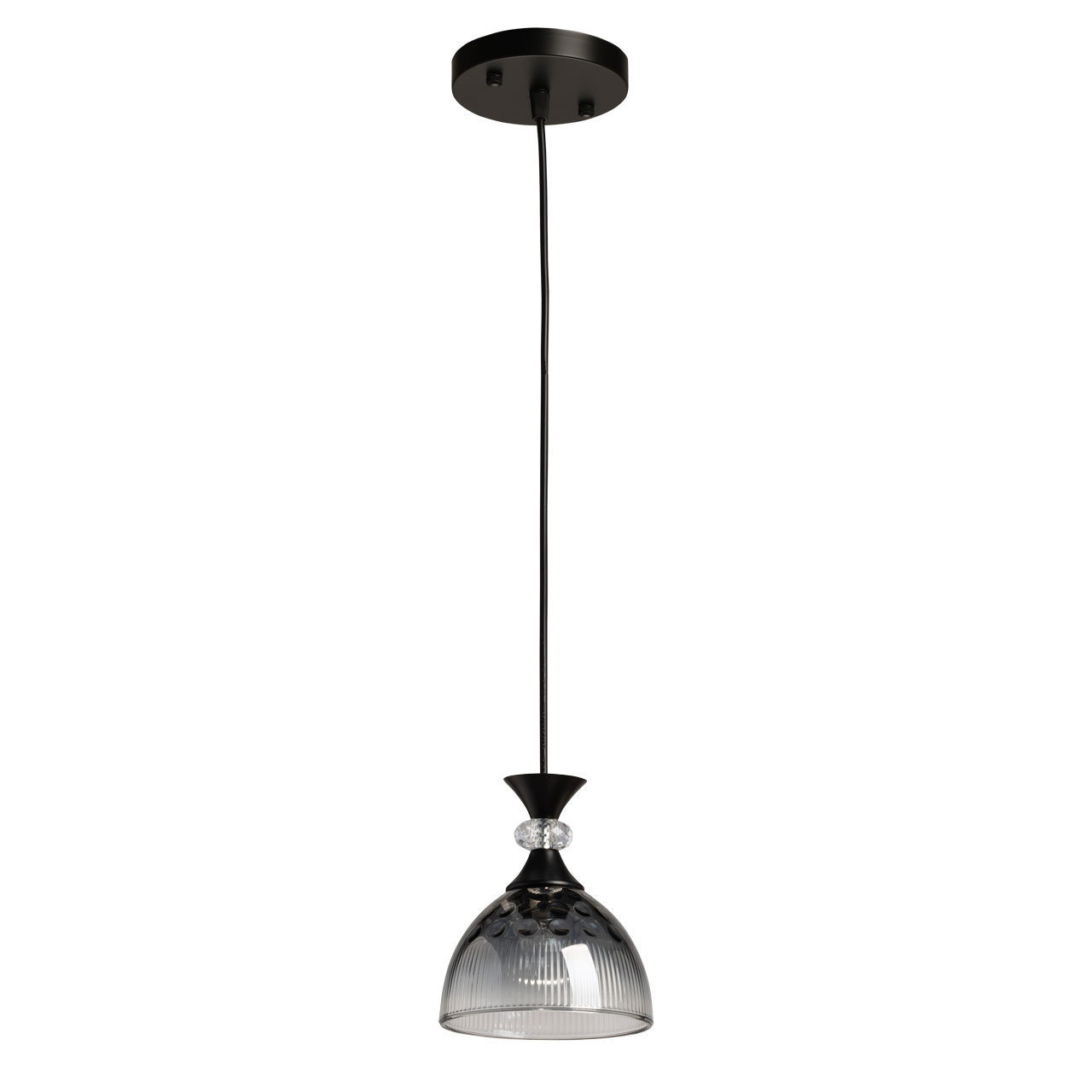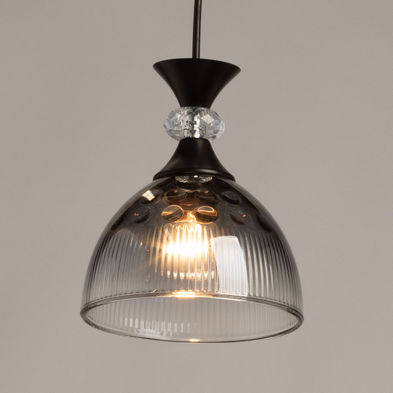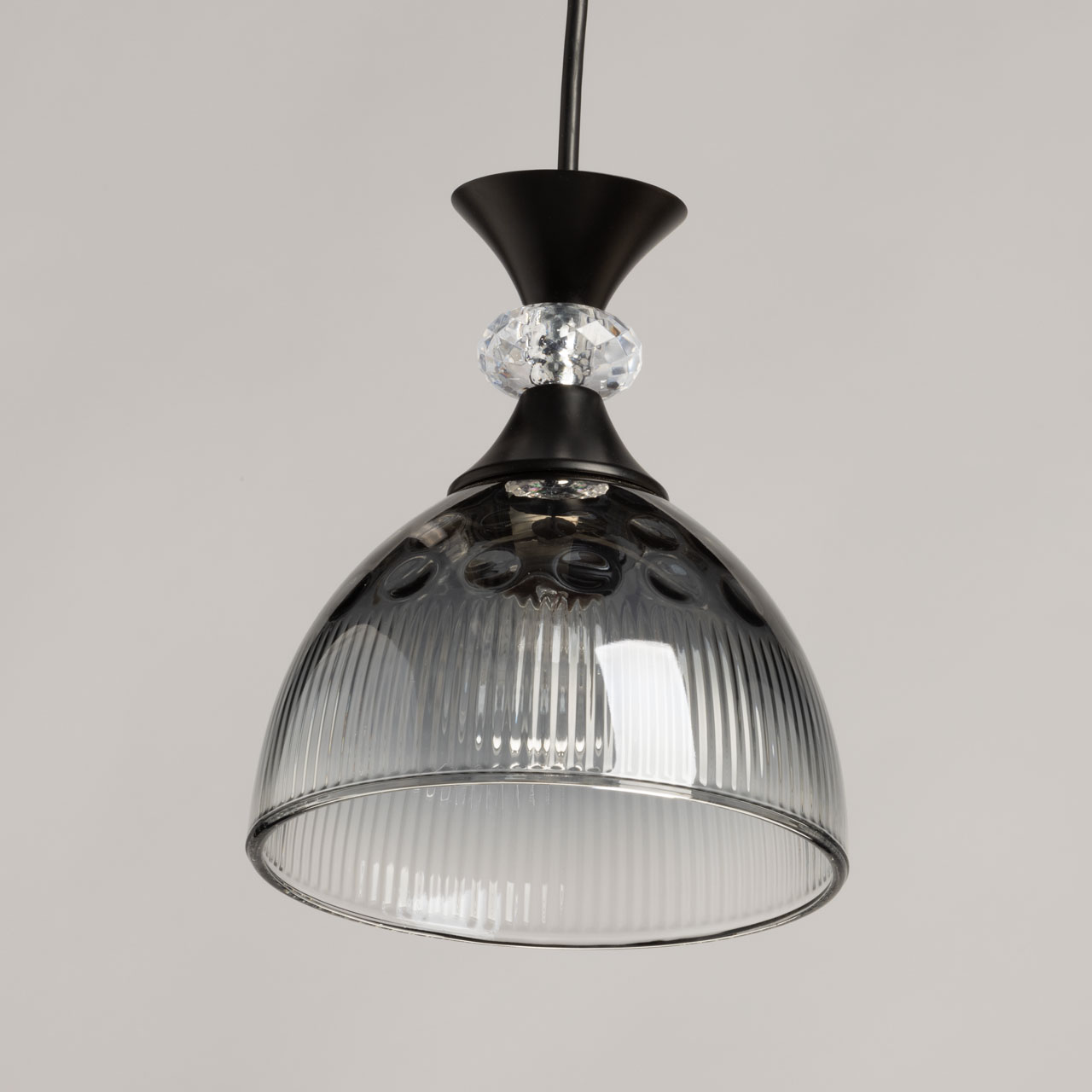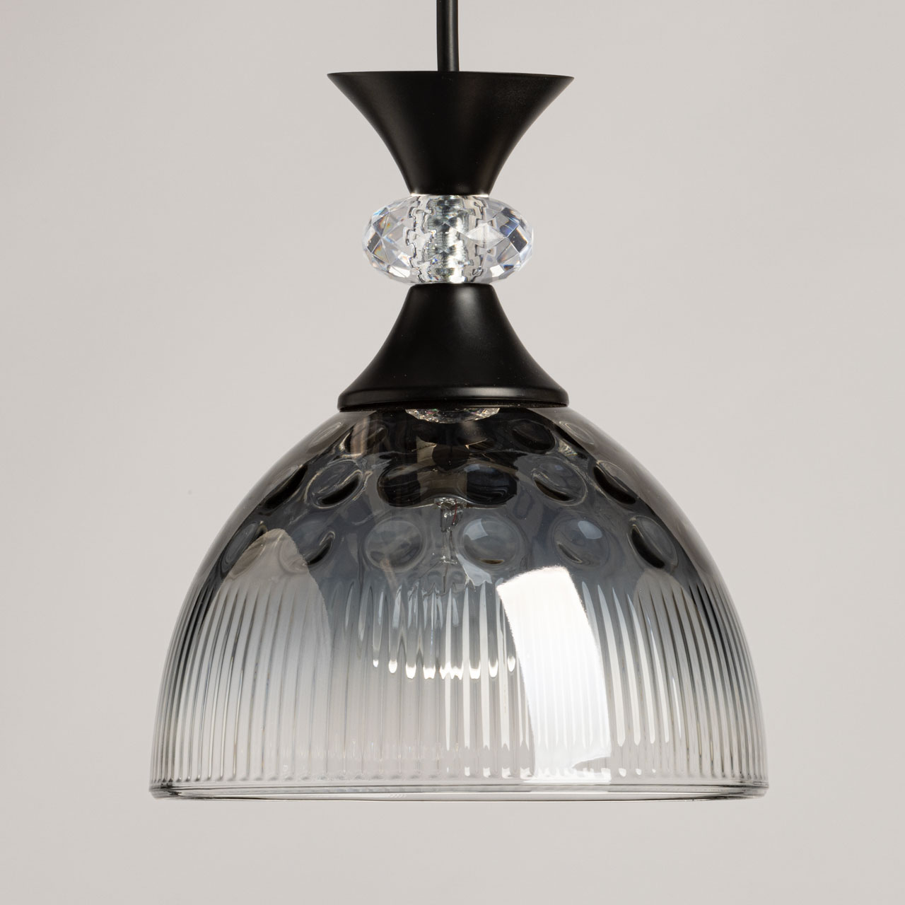 Металлическое основание светильника окрашено в черный цвет. Стеклянный плафон отлит в сложную форму и гальванизирован в дымчатый цвет с эффектом градиента от темного к светлому. Декоративный элемент на подвесе выполнен из акрила.