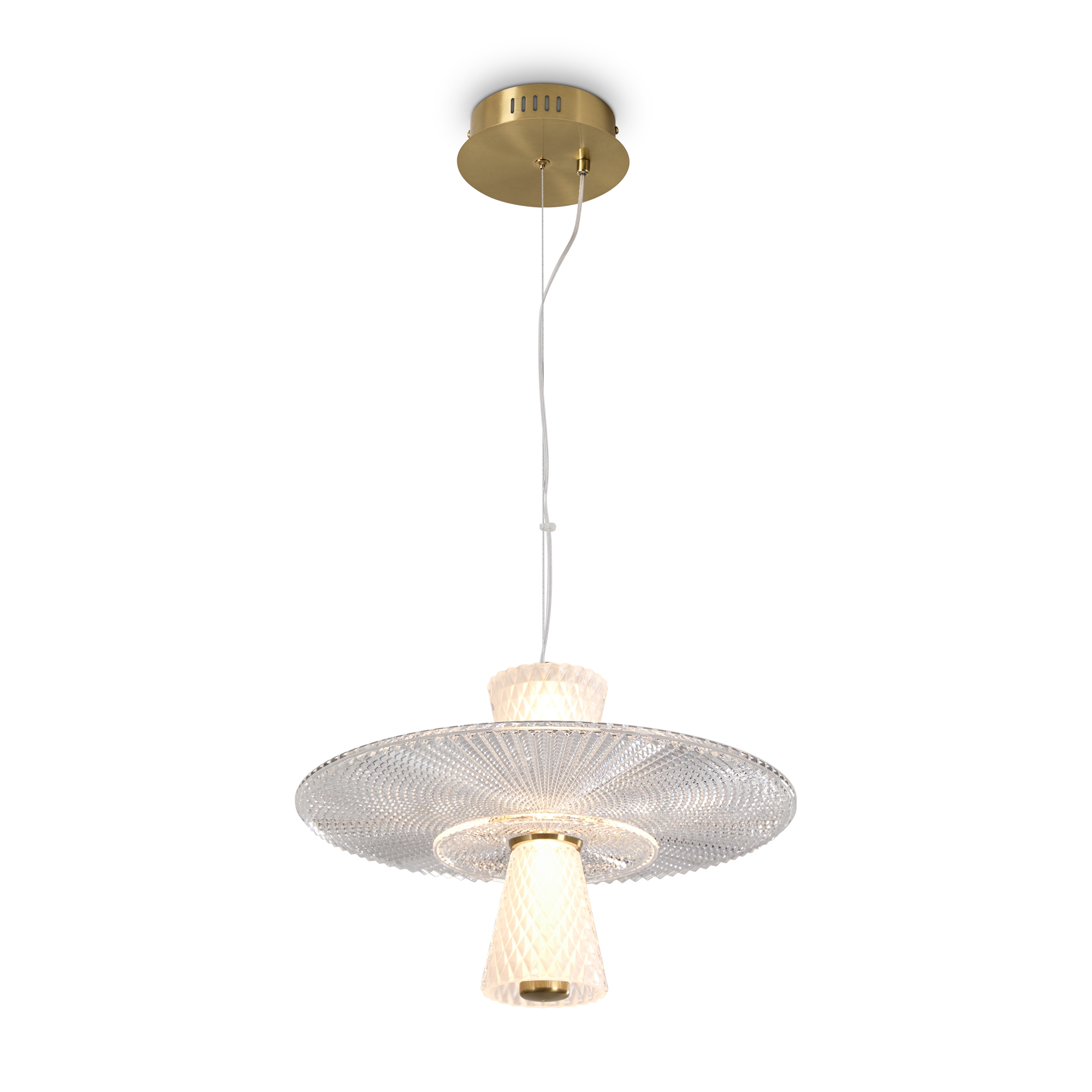 Серия Grail представлена подвесными светильниками с рельефным стеклом, имитирующим хрустальные грани в прозрачном и матовом покрытии. Арматура - металл латунного цвета. Источник света спрятан внутри рельефного стаканчика с узором «ромбик». Два варианта подвесов: с одним ярусом и с двумя, прекрасно сочетаются и придают изюминку даже самому минималистичному интерьеру. Плафоны выполнены из прозрачного акрила, имитирующего рельефное стекло. Оснащены LED источником света 3000K. Сочетают классическую эстетику хрустальных ваз с современными технологиями, создавая элегантное и эффективное освещение.