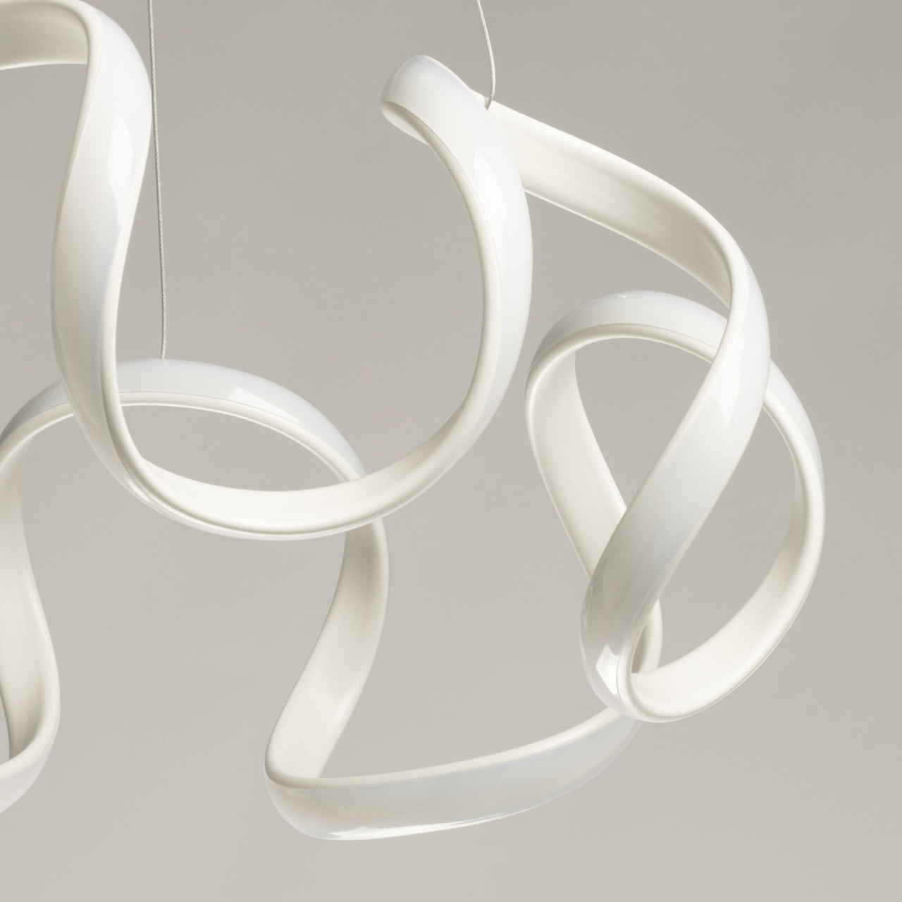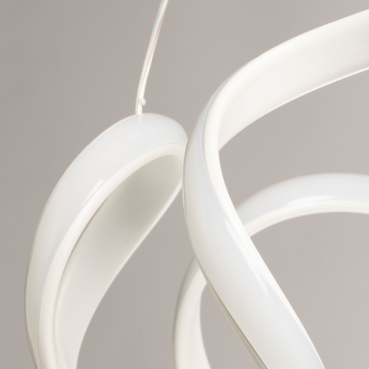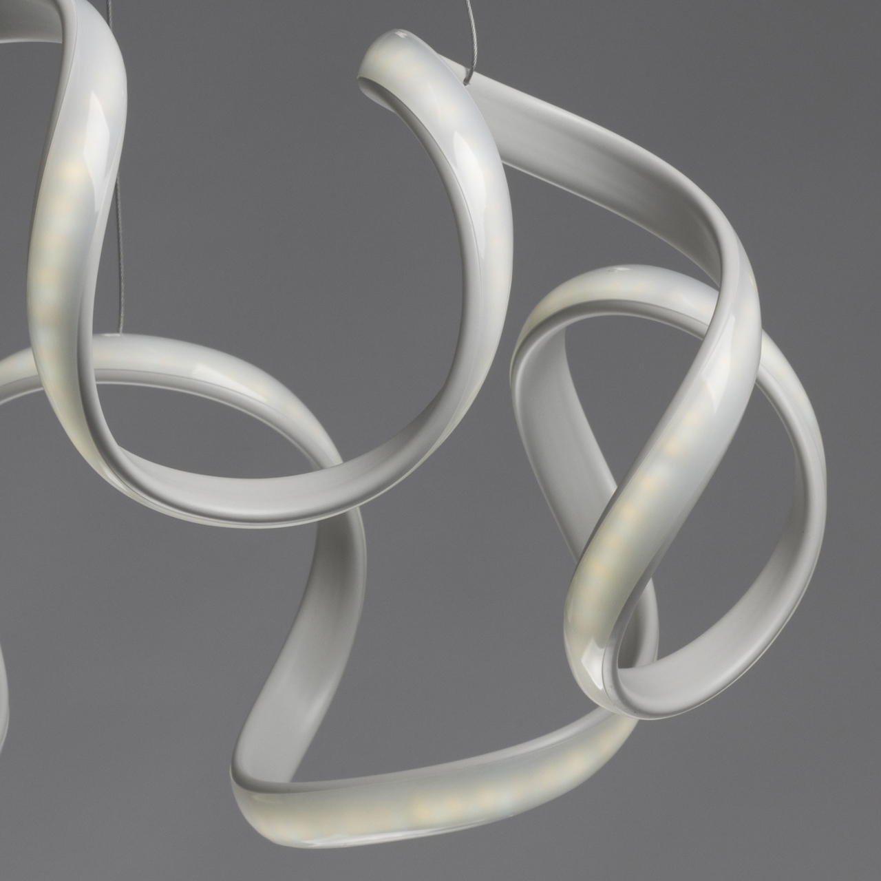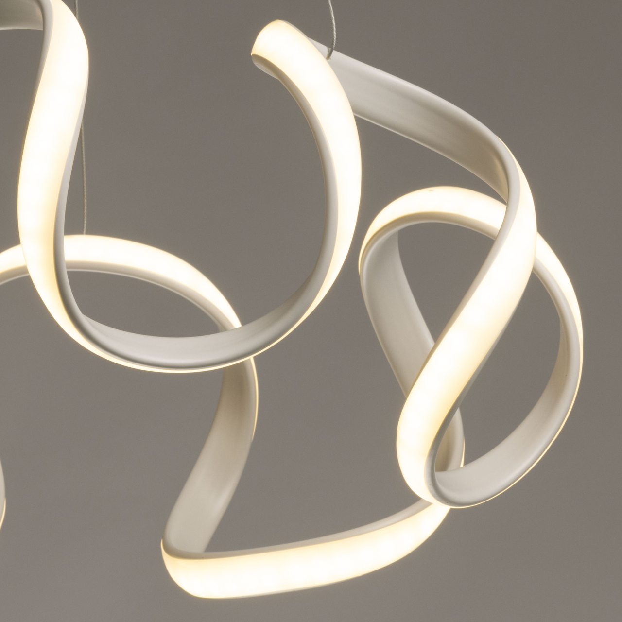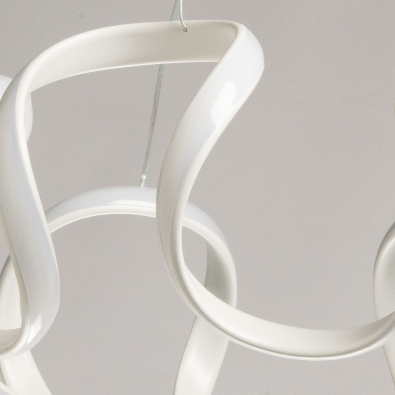 Металлическое основание подвесной люстры окрашено в белый цвет. Корпус плафона выполнен акрила и окрашен в белый цвет. Светодиодные источники света закрыты белым силиконом.