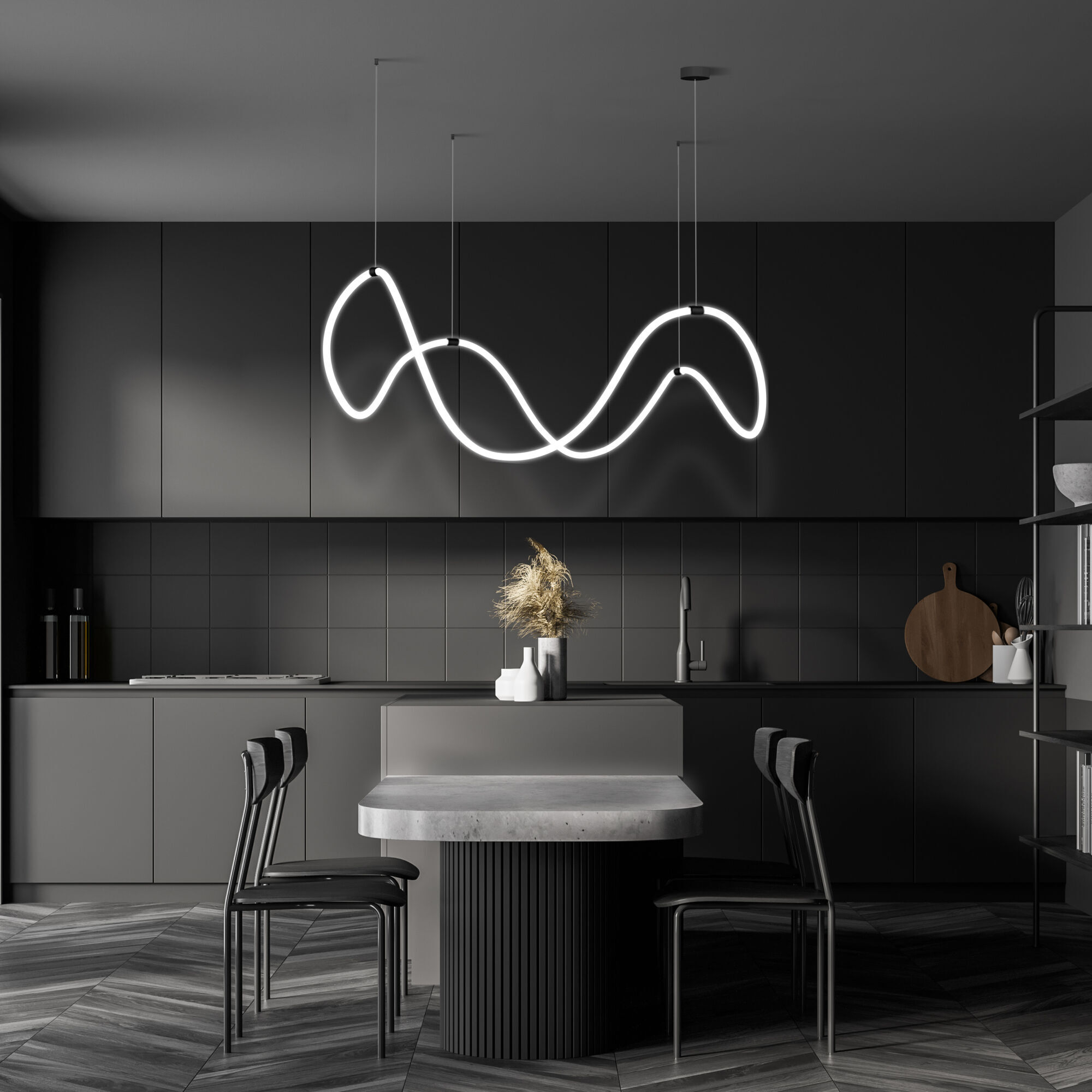 Необычная люстра из гибкого неона Full Light с пультом управления способна в корне изменить привычное восприятие интерьера гостиной, спальни, кухни или кабинета. Благодаря гибкости неон можно расположить совершенно в разных вариациях.
