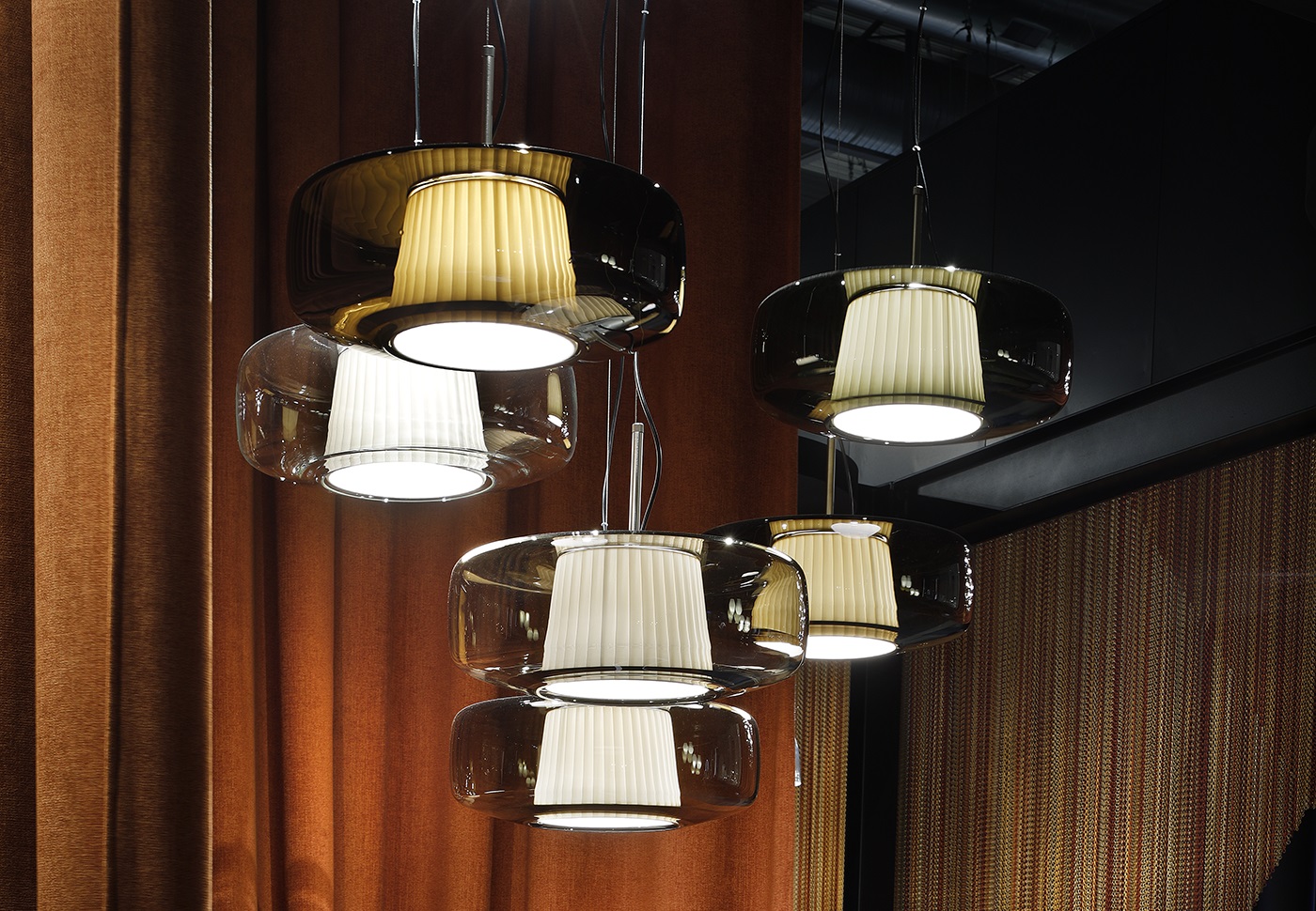 Подвесной светильник Vistosi Plisse SP G Crystal с арматурой матового бронзового цвета. Выдувное стекло диффузора прозрачного цвета скрывает внутренний тканевый абажур и дает жизнь игре прозрачности, цветов и текстур, которые делают Plissè элегантным элементом, способным охарактеризовать и придать индивидуальность помещению, в котором он находится.