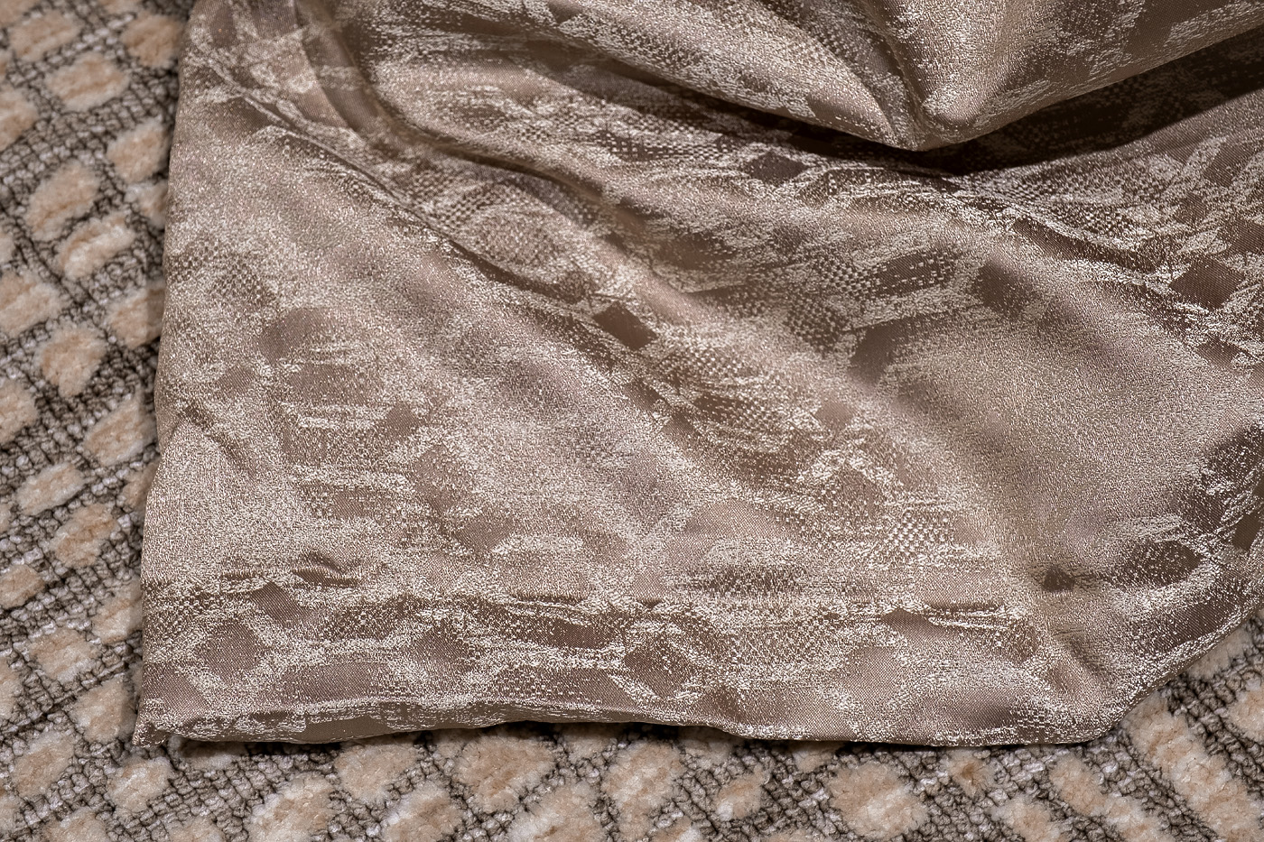 Жаккардовое покрывало с интересным геометрическим рисунком. Красота геометрии заключаются в ее универсальности и простоте. Ткань с таким рисунком подходит для интерьеров как в классических, так и в современных направлениях, и служит ярким акцентом, притягивающим взгляд. Изделие представлено в бежевом цвете. УХОД: Деликатная машинная стирка при температуре не выше 30 градусов. Отбеливание запрещено. Гладить при средней температуре до 150 градусов. Разрешена сухая химчистка. Разрешена низкотемпературная машинная сушка.