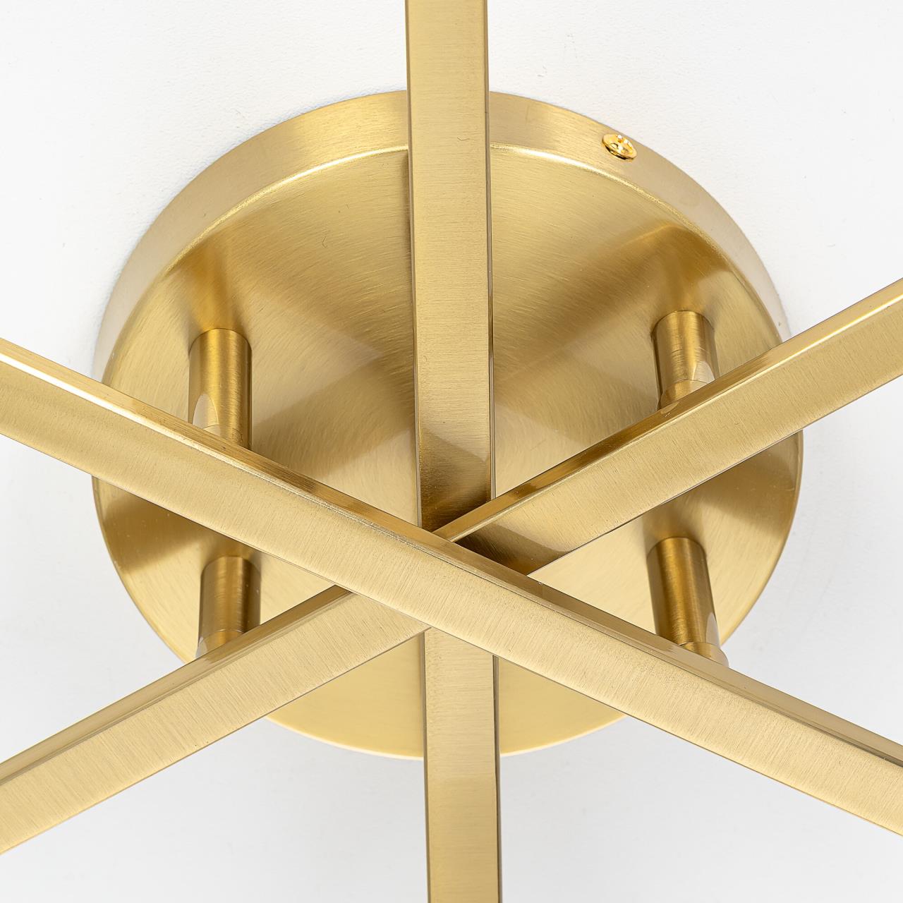 Корпус люстры изготовлен из металлического сплава стильного бронзового оттенка. Плафоны-сферы из белого матового стекла разного диаметра попарно расположены на горизонтальных рожках-штангах. Плафоны имеют диаметр 10 и 13см, размещены симметрично относительно центра люстры. Форма, материал и расположение плафонов обеспечивают мягкий заливной свет, который равномерно распределяется по всему помещению.