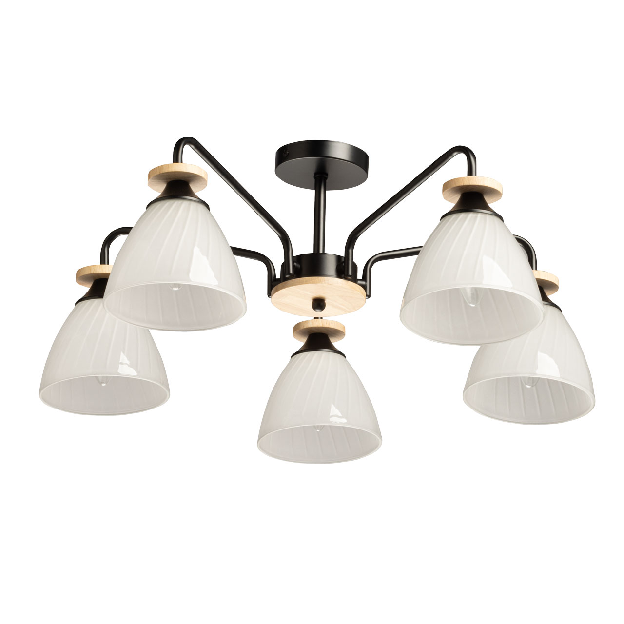 Металлическое основание потолочной люстры окрашено в черный цвет. Стеклянные плафоны отлиты в форму и окрашены в белый цвет с внутренней стороны. Светильник декорирован элементами из натурального светлого дерева.