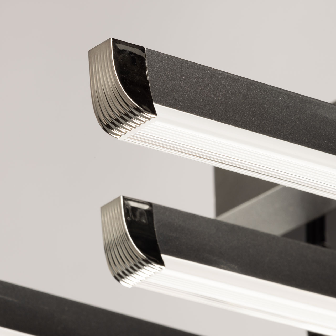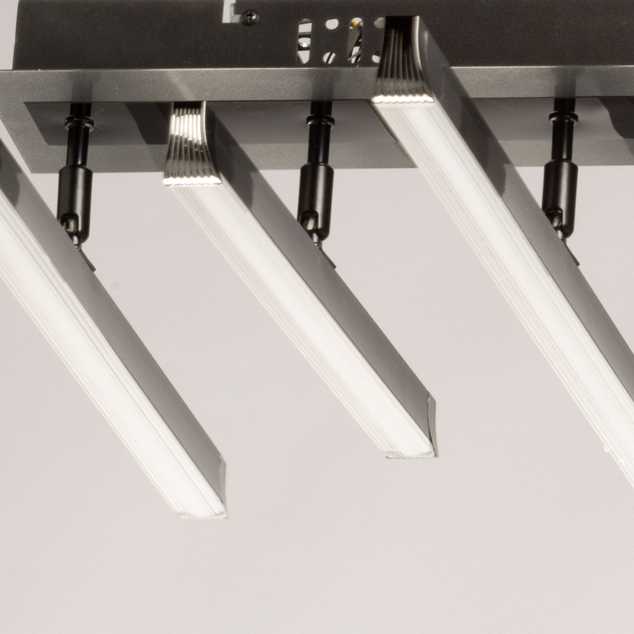 Металлическое основание потолочной люстры окрашено в цвет графита. Светодиодные источники свет закрыты белым акрилом.