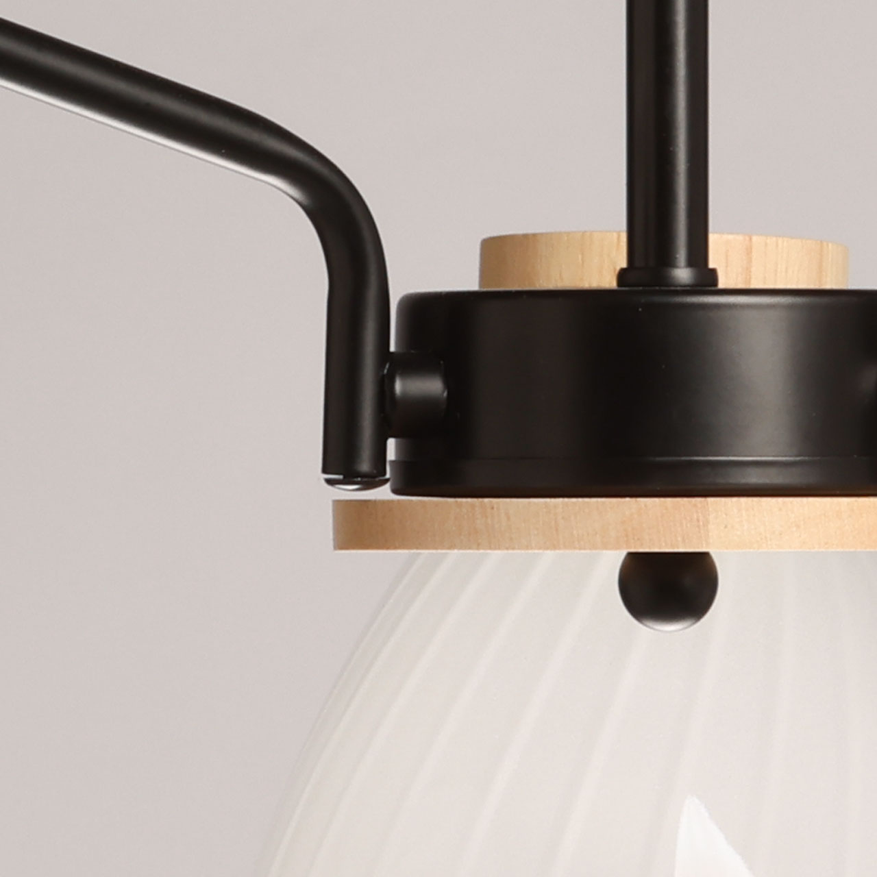 Металлическое основание потолочной люстры окрашено в черный цвет. Стеклянные плафоны отлиты в форму и окрашены в белый цвет с внутренней стороны. Светильник декорирован элементами из натурального светлого дерева.