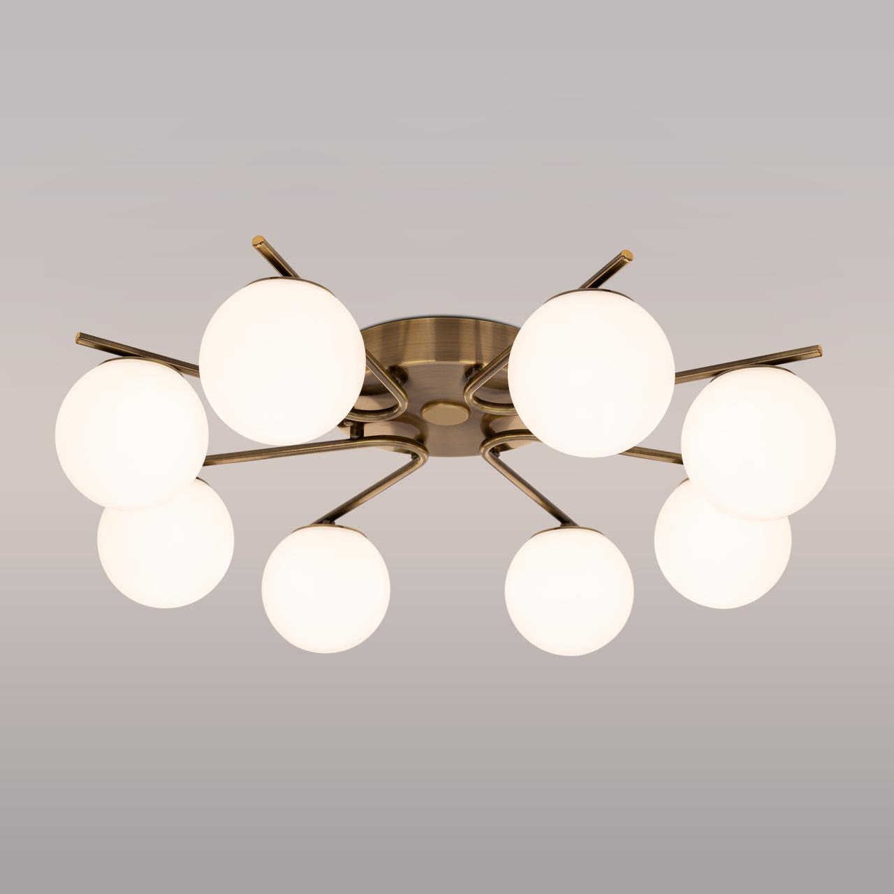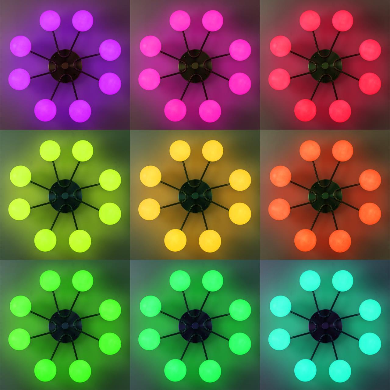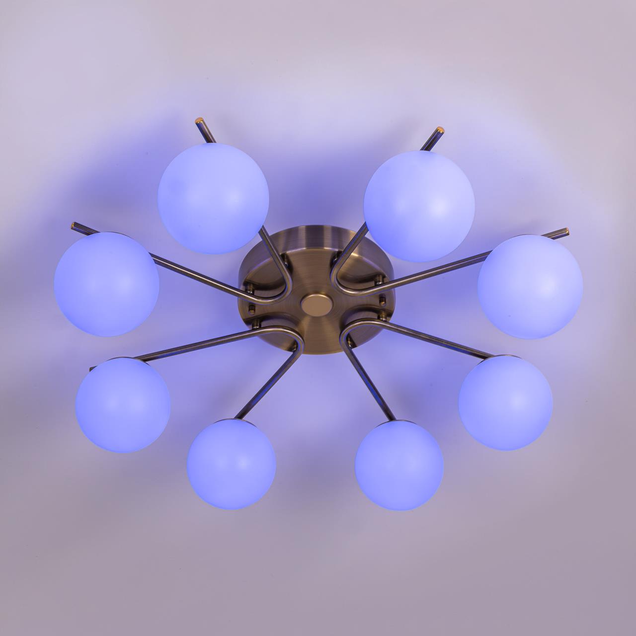 Люстра восьмирожковая с круглым основанием, корпус металлический, цвет бронза. Плафоны в форме шара, изготовлены из матового оптического полимера. Внутри каждого плафона расположена уникальная светодиодная панель, обеспечивающая яркое основное освещение или красочную RGB подсветку, с плавной регулировкой яркости во всех режимах света.