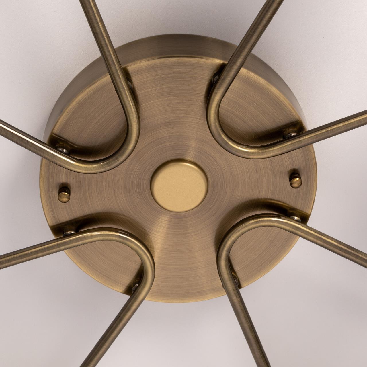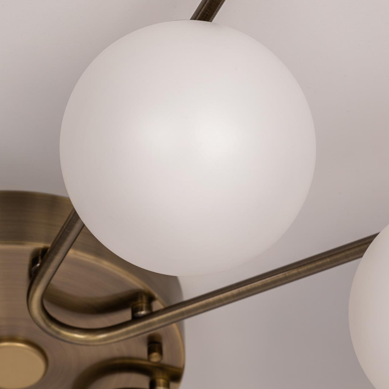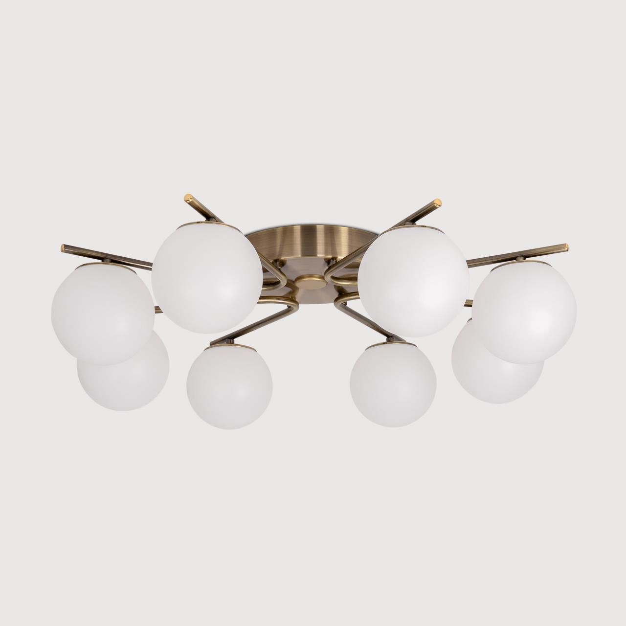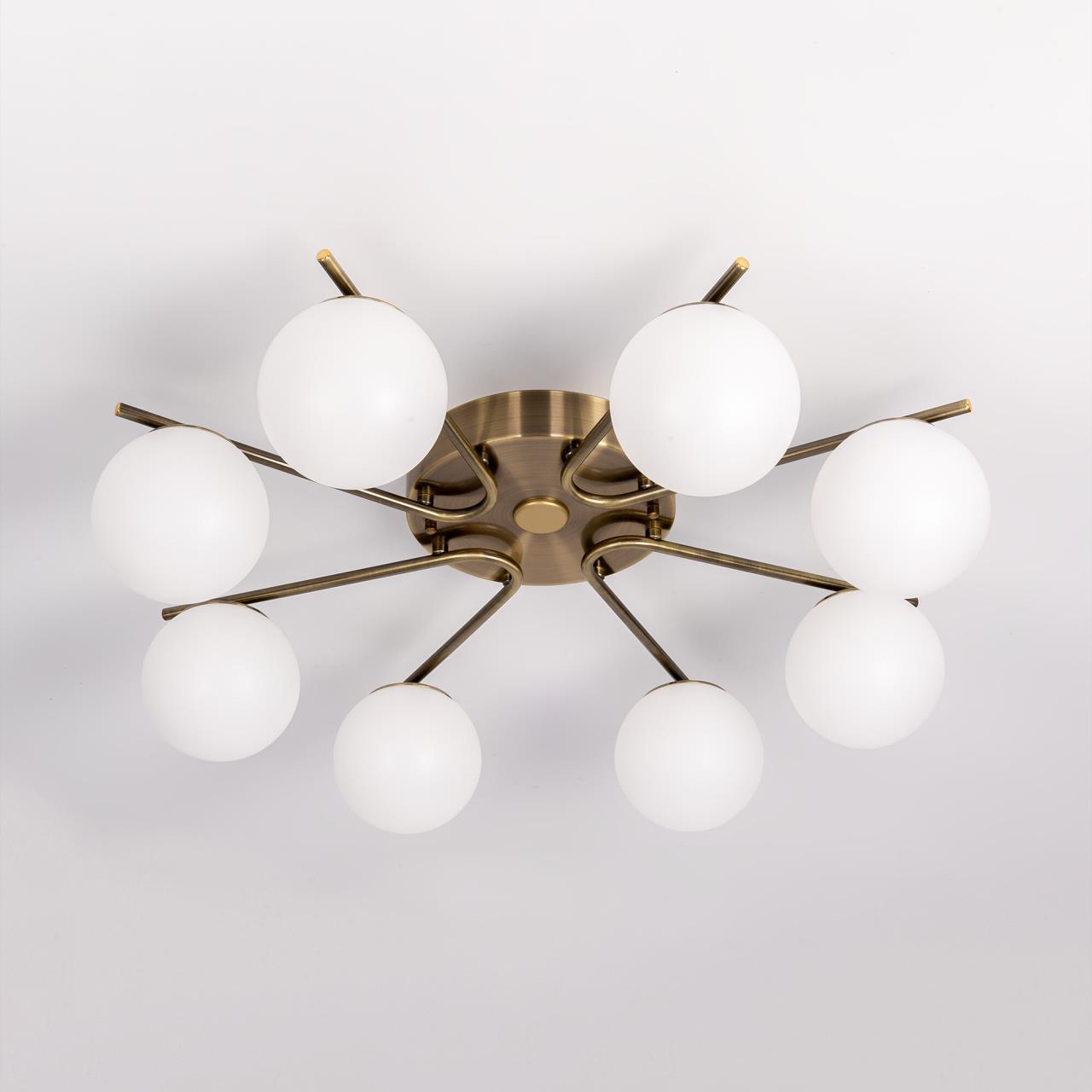 Люстра восьмирожковая с круглым основанием, корпус металлический, цвет бронза. Плафоны в форме шара, изготовлены из матового оптического полимера. Внутри каждого плафона расположена уникальная светодиодная панель, обеспечивающая яркое основное освещение или красочную RGB подсветку, с плавной регулировкой яркости во всех режимах света.