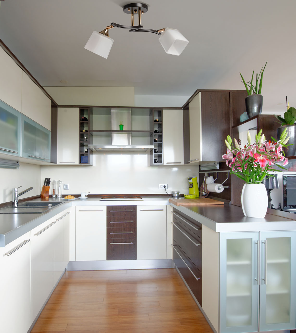 Металлическое основание потолочной люстры окрашено в цвет кофе. Отдельные элементы основания гальванизированы в цвет золота. Стеклянные плафоны отлиты в оригинальную форму и окрашены в белый цвет с внутренней стороны.Данную модель всегда можете купить в интернет-магазине 220svet.