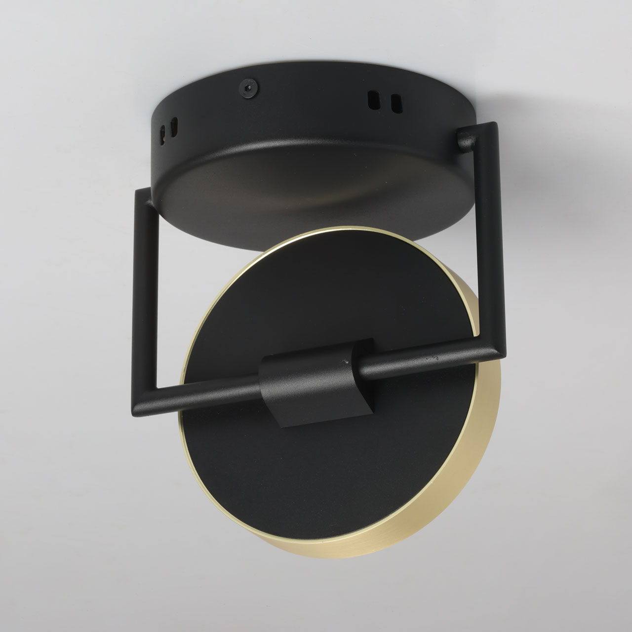 Металлическое основание потолочного светильника обработано по технологии порошкового окрашивания в черный цвет. Корпус плафона гальванизирован в цвет золота. Светодиодные источники света закрыты белым матовым акрилом.