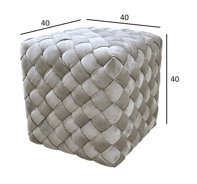 Необычный пуфик с интересной отделкой сиденья из плетеных лент ткани с наполнителем ППУ внутри в ромбическом узоре. Нейтральный серо-бежевый цвет велюра и компактность дают возможность вписать такой предмет мебели в разнообразные варианты интерьера.