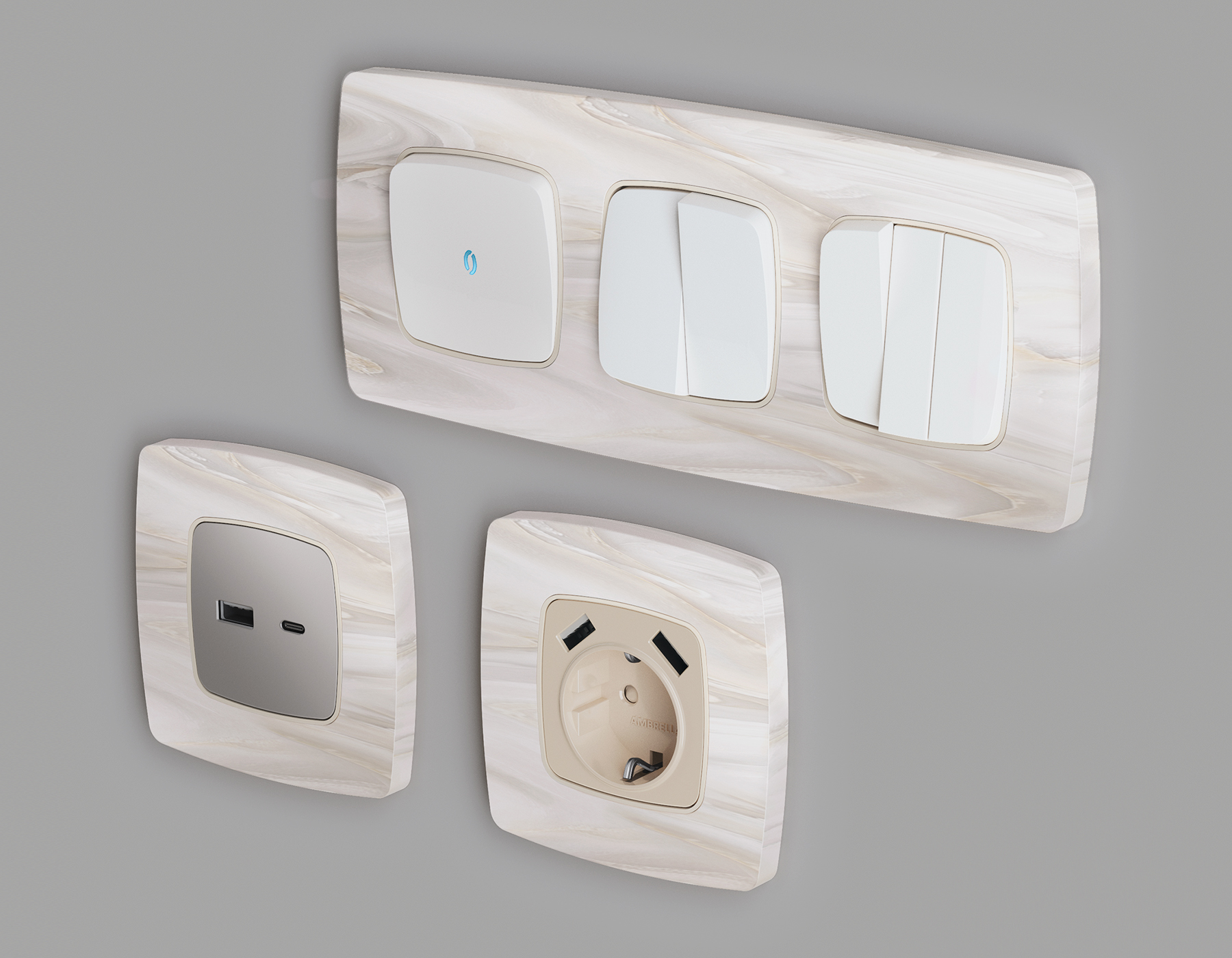 Многогранный ассортимент Ambrella Volt включает в себя механизмы, лицевые панели и рамки, а также комплекты, доступные в различных цветовых решениях. Продукция представлена в модульном исполнении, что позволяет гибко настраивать внешнийвид и функциональность. Вам будет легко заменить лицевую панель, рамку или механизм, найдя идеальное сочетание цветов.