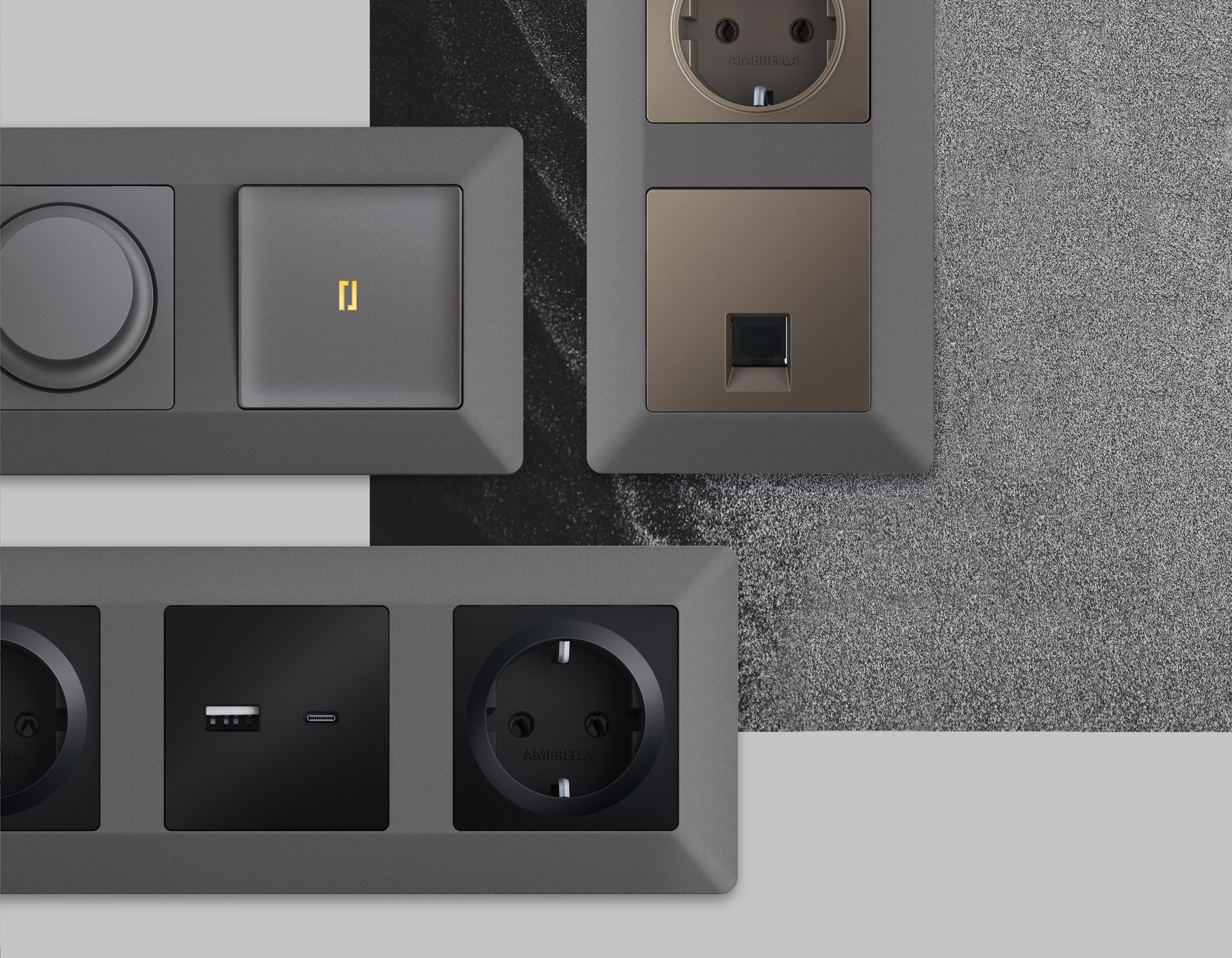Многогранный ассортимент Ambrella Volt включает в себя механизмы, лицевые панели и рамки, а также комплекты, доступные в различных цветовых решениях. Продукция представлена в модульном исполнении, что позволяет гибко настраивать внешнийвид и функциональность. Вам будет легко заменить лицевую панель, рамку или механизм, найдя идеальное сочетание цветов.