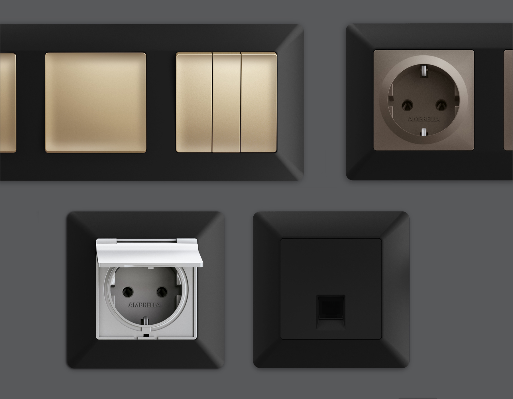 Многогранный ассортимент Ambrella Volt включает в себя механизмы, лицевые панели и рамки, а также комплекты, доступные в различных цветовых решениях. Продукция представлена в модульном исполнении, что позволяет гибко настраивать внешнийвид и функциональность. Вам будет легко заменить лицевую панель, рамку или механизм, найдя идеальное сочетание цветов.