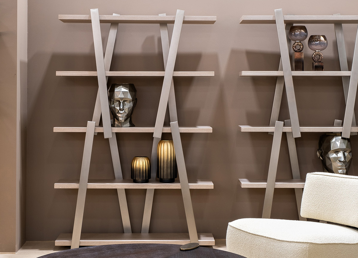 Оригинальный стеллаж с полками из МДФ, отделанного светлым шпоном, станет прекрасным дополнением современной гостиной, кабинета или библиотеки. Необычный дизайн, в котором деревянные полки соединены перекрещивающимися металлическими опорами цвета античной бронзы, приковывает взгляд и делает стеллаж похожим на арт-объект. Стеллаж прекрасно подойдет для размещения книг, фотографий, а также предметов декора.