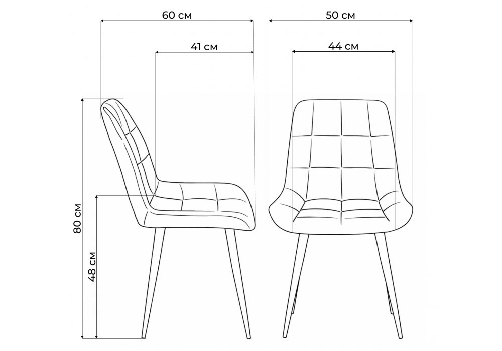 Материал каркаса - металл; Материал сиденья - велюр; Материал обивки - велюр; Ширина - 50; Глубина - 60; Высота - 80; Ширина сиденья - 44; Глубина сиденья - 41; Высота сиденья - 48;