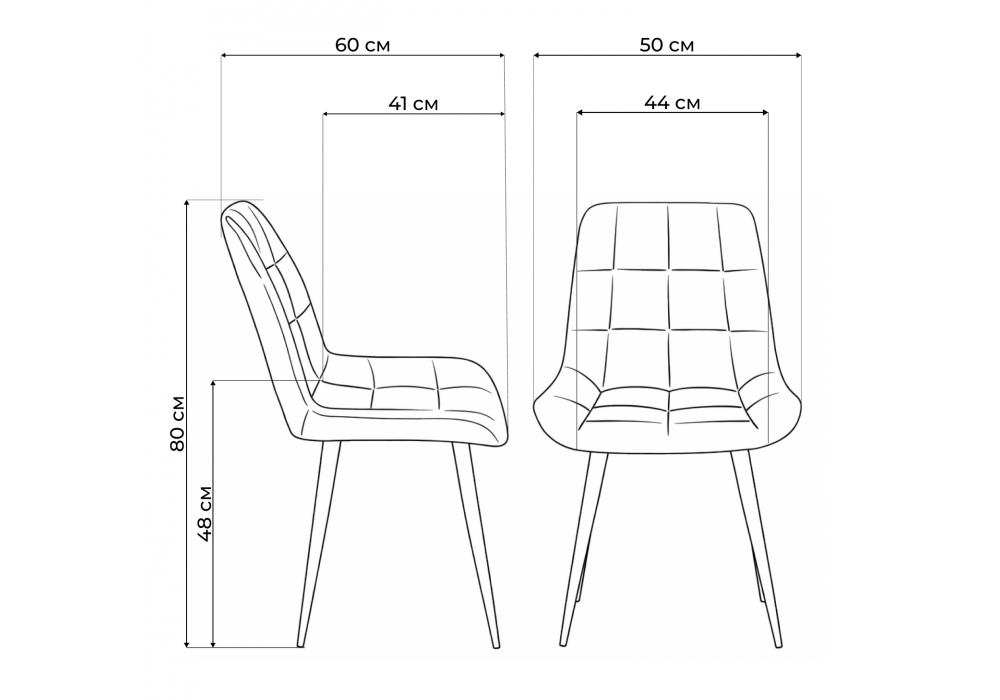 Материал каркаса - металл; Материал сиденья - велюр; Материал обивки - велюр; Ширина - 50; Глубина - 60; Высота - 80; Ширина сиденья - 44; Глубина сиденья - 41; Высота сиденья - 48;